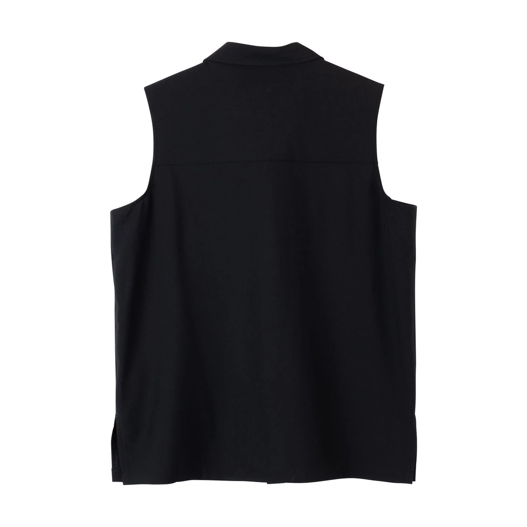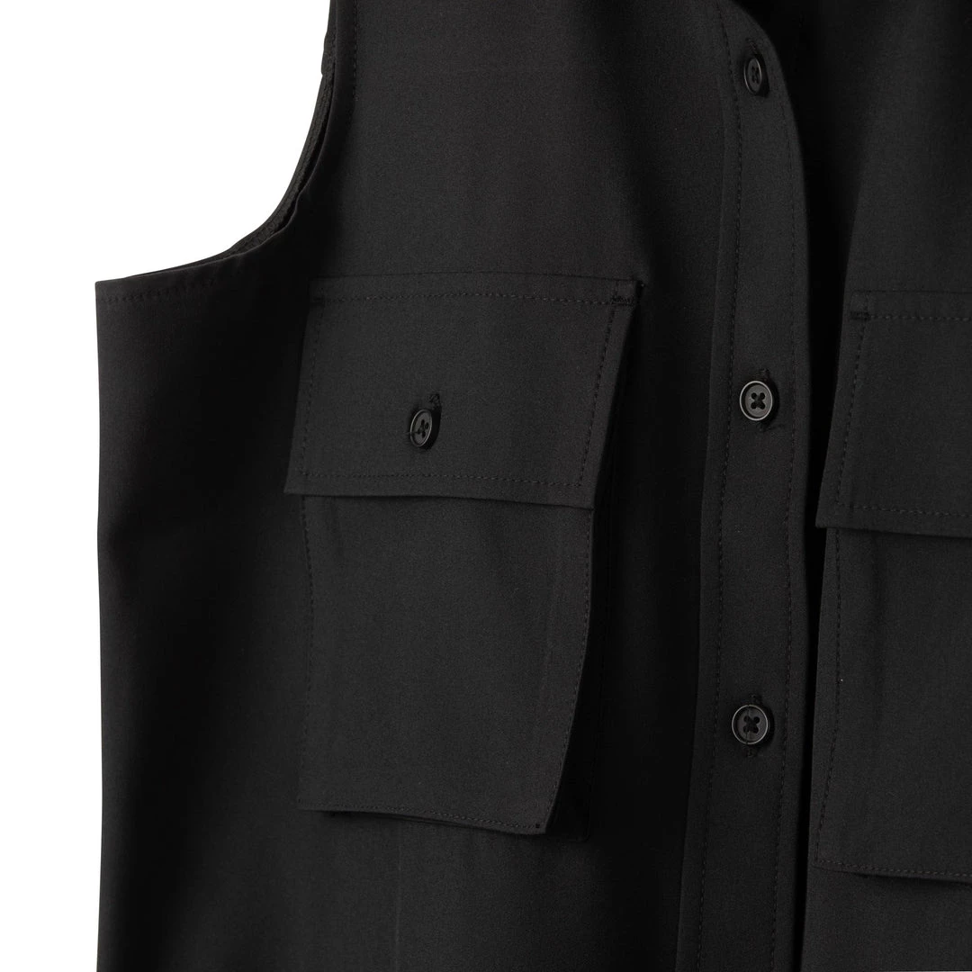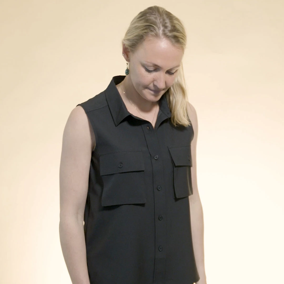 Relaxed fit, sleeveless button up shirt, stand collar, bellowed chest patch pockets with button closure, polyester matte buttons, back yoke, straight hem with side vents.