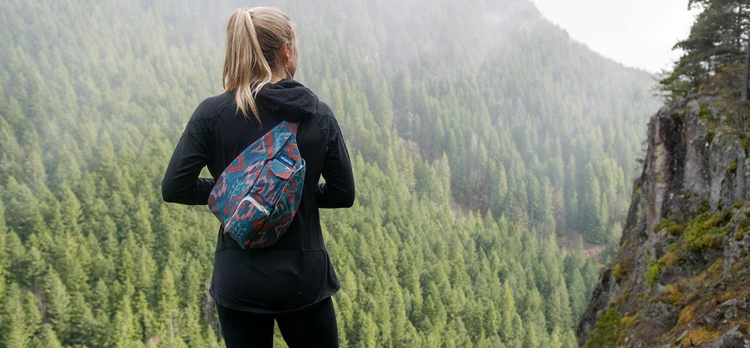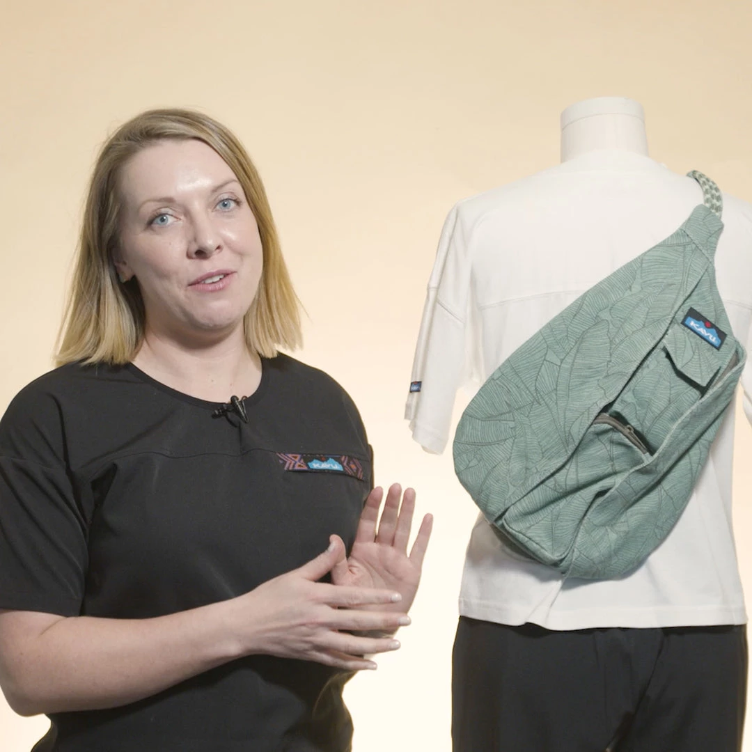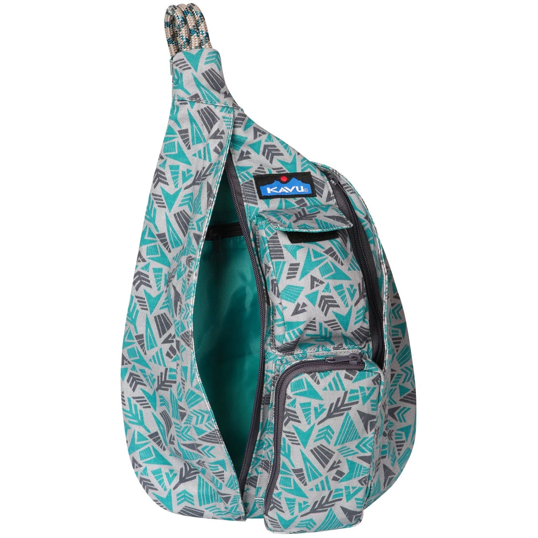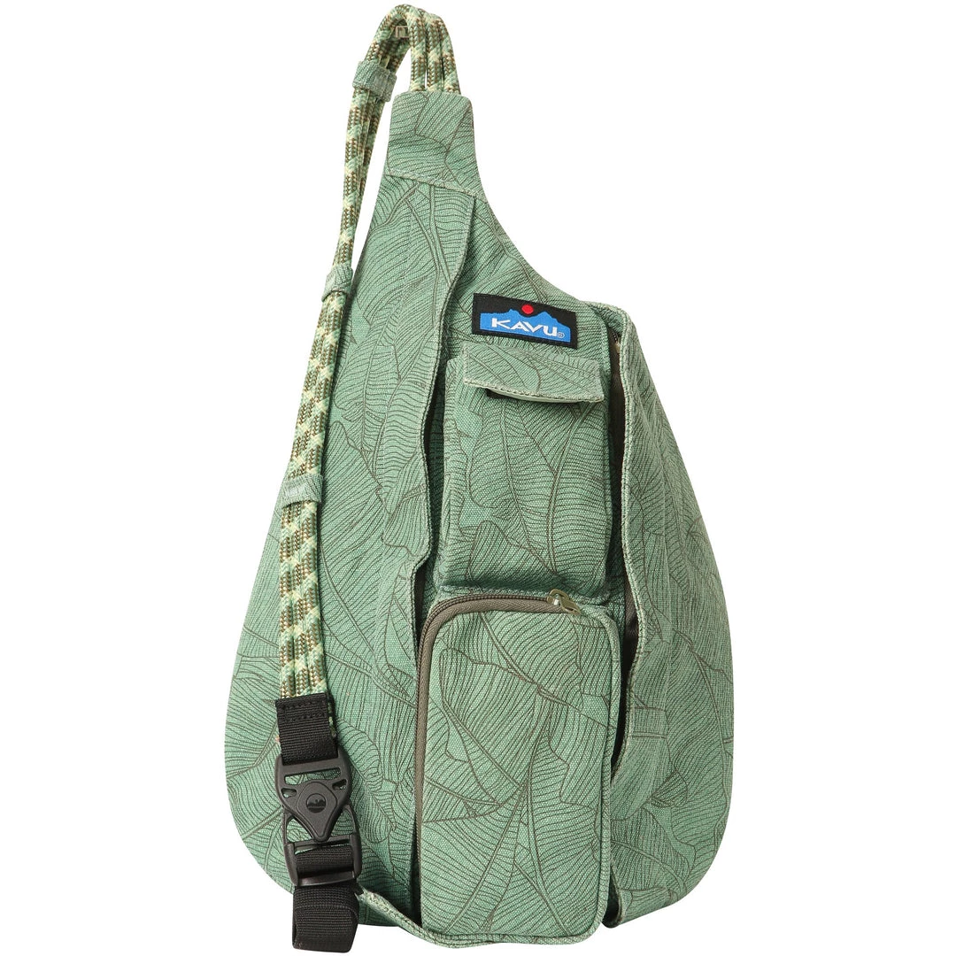 Mini sling pack with adjustable rope shoulder strap and side release buckle, two vertical zip compartments, two key or cell phone pockets, padded back with KAVU embroidery.