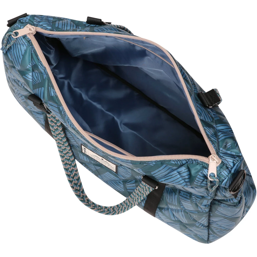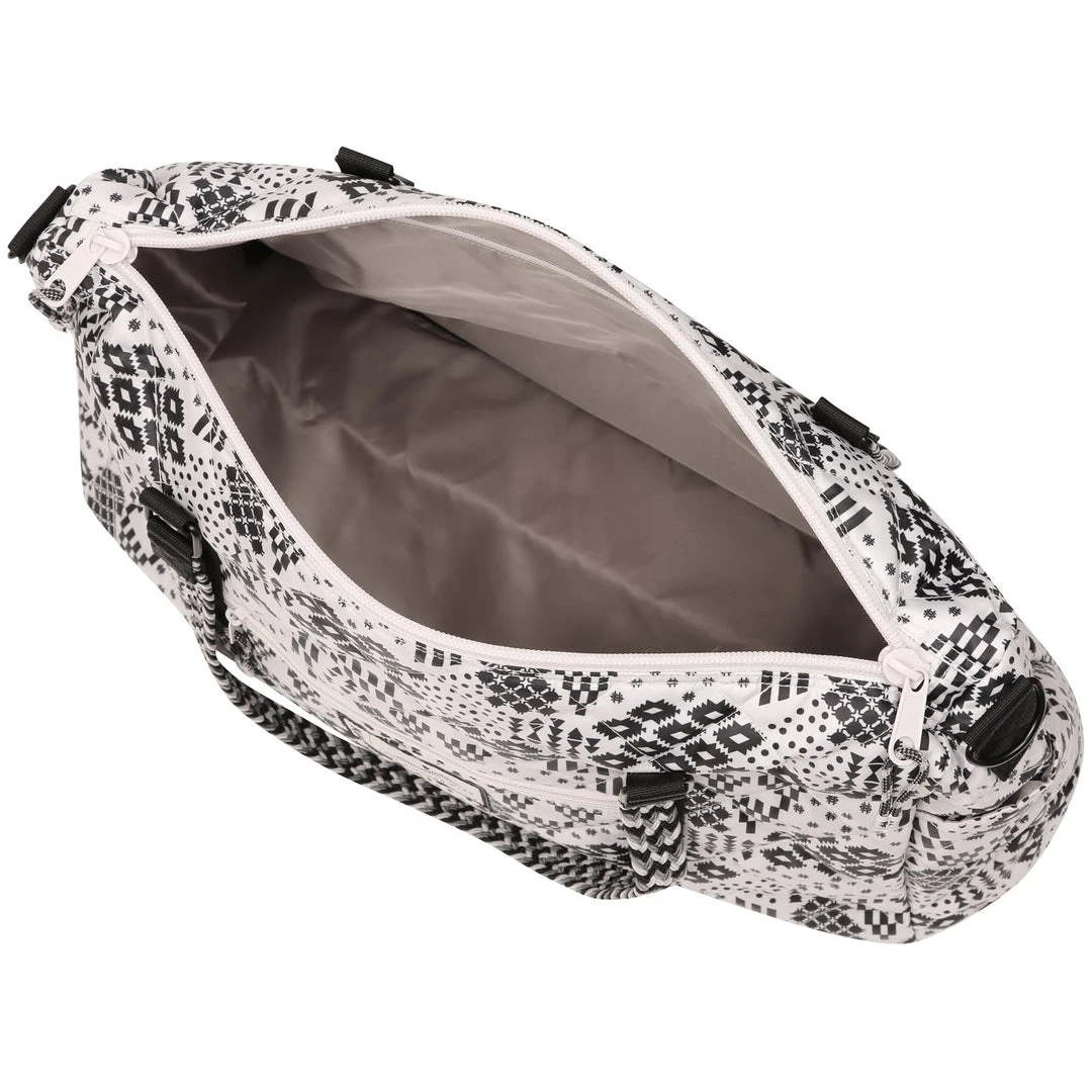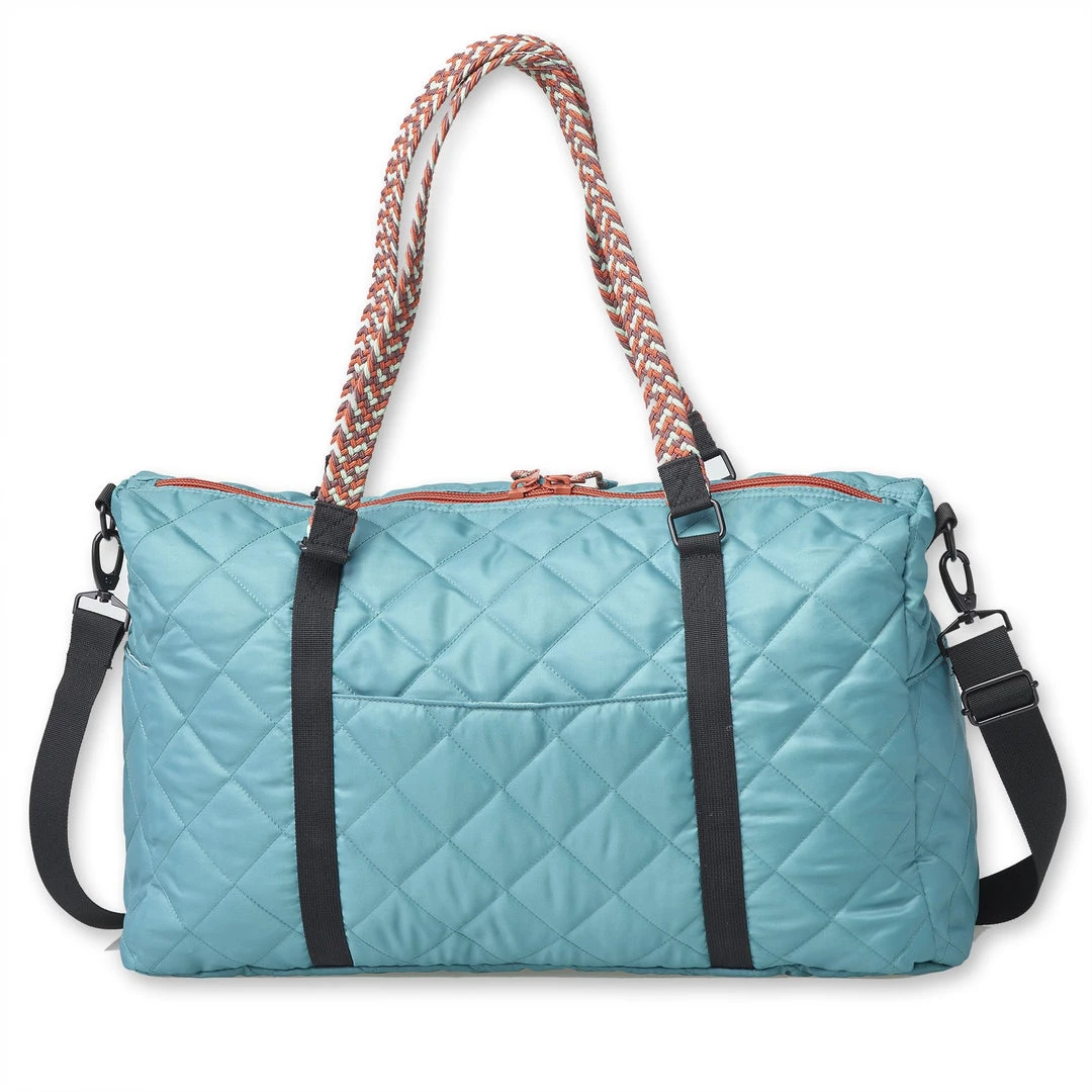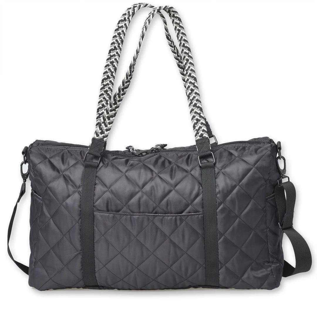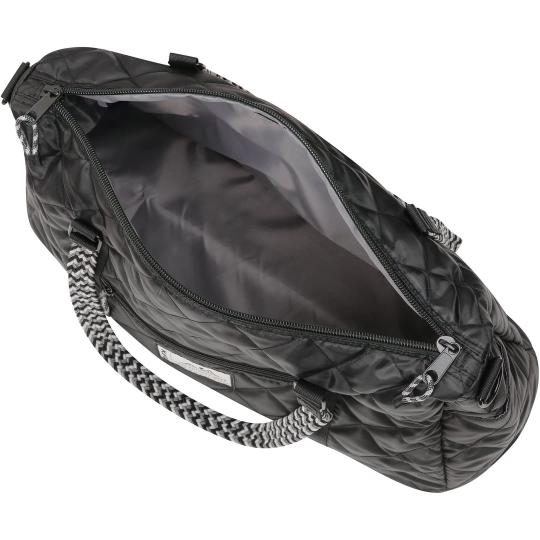 This diamond quilted cross body tote duffel features adjustable shoulder strap that can detach with metal d-ring and spring hook hardware, braided elastic rope hand / shoulder straps, main compartment with zip closure, one exterior zip pocket and flat pocket with snap closure, two side stash pockets, internal zip and organizational pockets, rope loop zip pulls and padded bottom panel.
