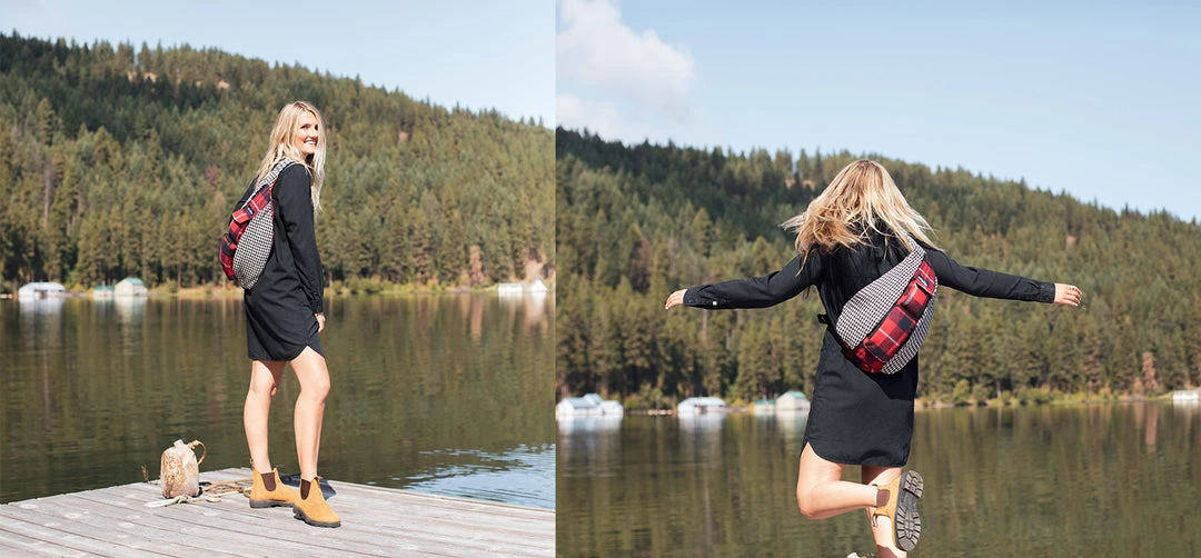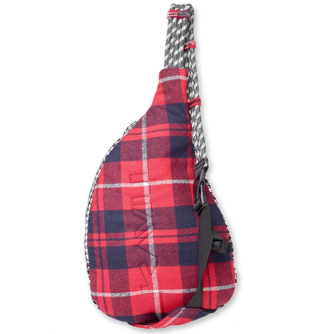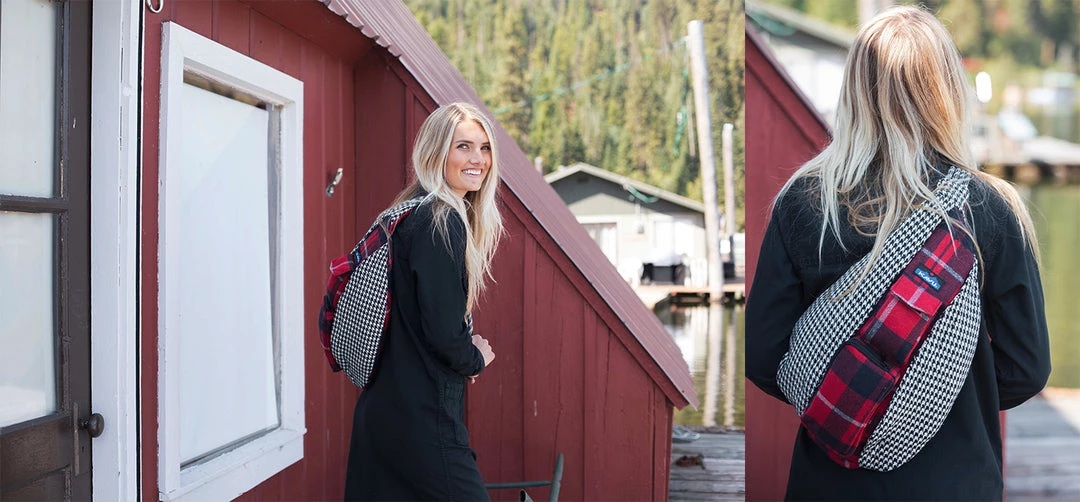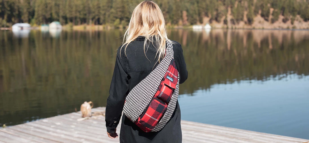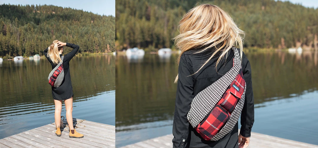 Sling pack with adjustable rope shoulder strap with side release buckle, two vertical zip compartments, two key or cell phone pockets, padded back with KAVU embroidery.