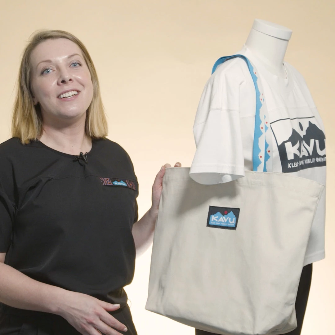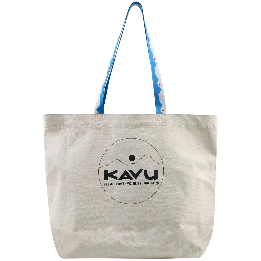 KAVU logo tote (one side woven label / one side screen print), fixed pattern webbing shoulder straps secured with box stitch and interior seam binding