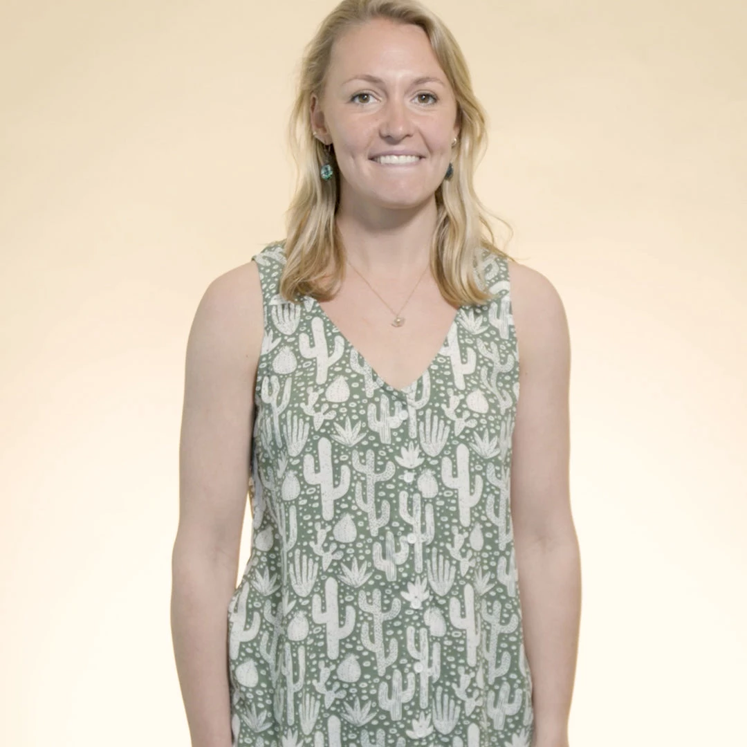 Free flow’n sleeveless button up blouse, v-neckline, straight from hem with 5″ curved back hem drop.
