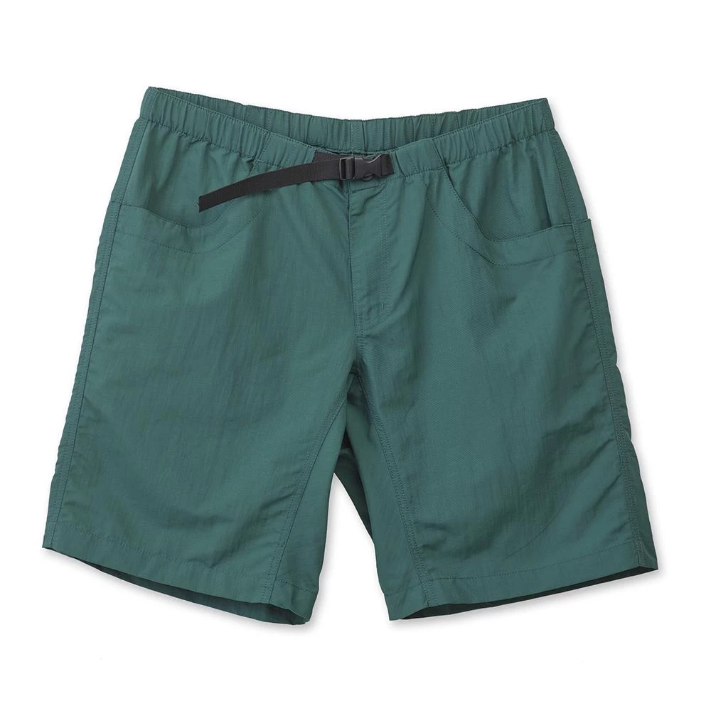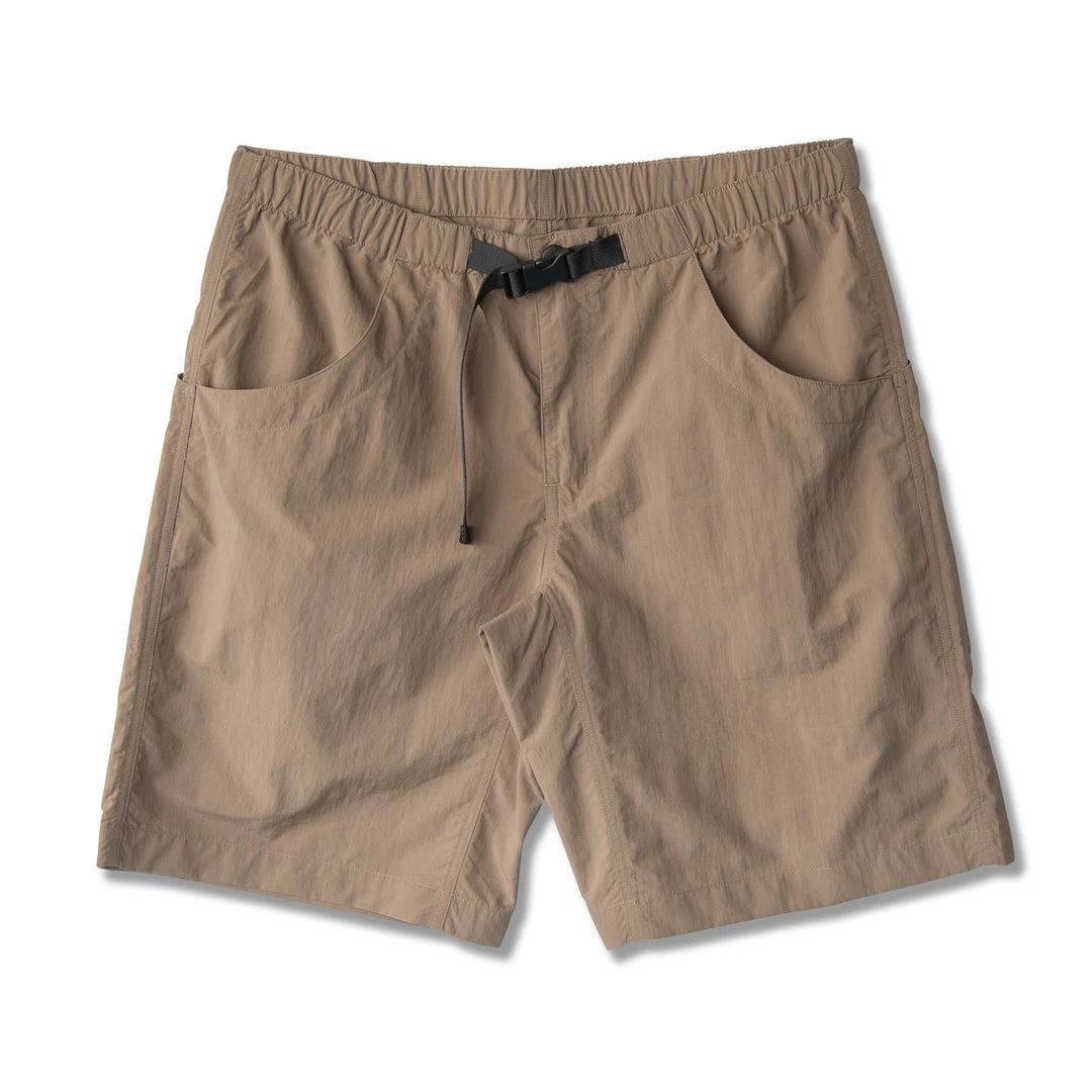 Loose fit, elastic waist short with rubberized snap and zip fly, built in ¾” nylon webbing belt with side release buckle, half-moon pockets with right rear internal wallet stay, mesh pocket bags, gusset, double needle reinforced seams.