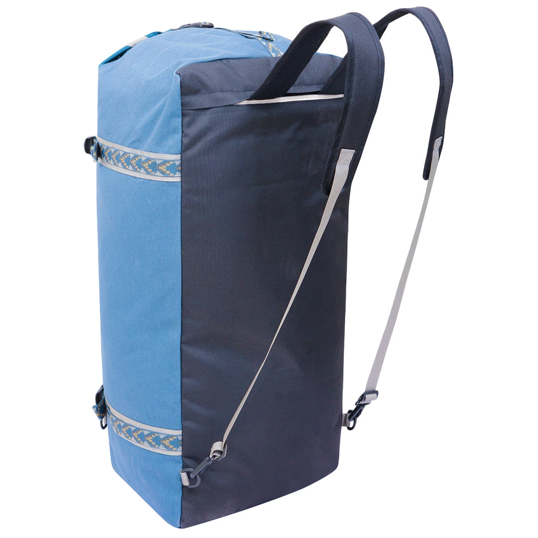Backpack duffel with adjustable padded backpack shoulder straps that can store in zip pocket when not in use, one adjustable and detachable padded duffel shoulder strap with plastic d-ring and snap hook hardware, fixed hand straps, exterior patterned webbing cinch straps with side release buckles on either end, additional side panel cinch straps, one exterior zip pocket, main compartment with two way zip, one interior zip and two mesh organizational pockets, rope loop zip pulls, padded bottom panel