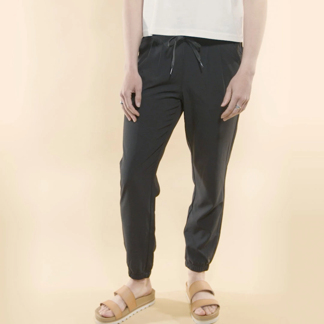 Relaxed fit, mid-rise jogger, half elastic waistband with drawstring and elastic hem cuffs, front pockets and pleats, back welt pocket.