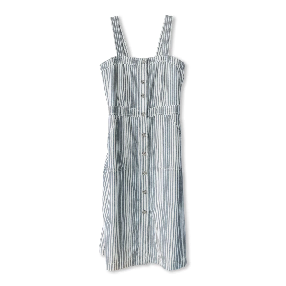 Semi-fitted jumper dress with fixed straps, full button placket on front with 25% certified recycled polyester buttons, elastic at back for added comfort and mobility, front and back princess seams, pieced waistband, utility pockets at front, straight hem, length hits between knee and mid-calf.