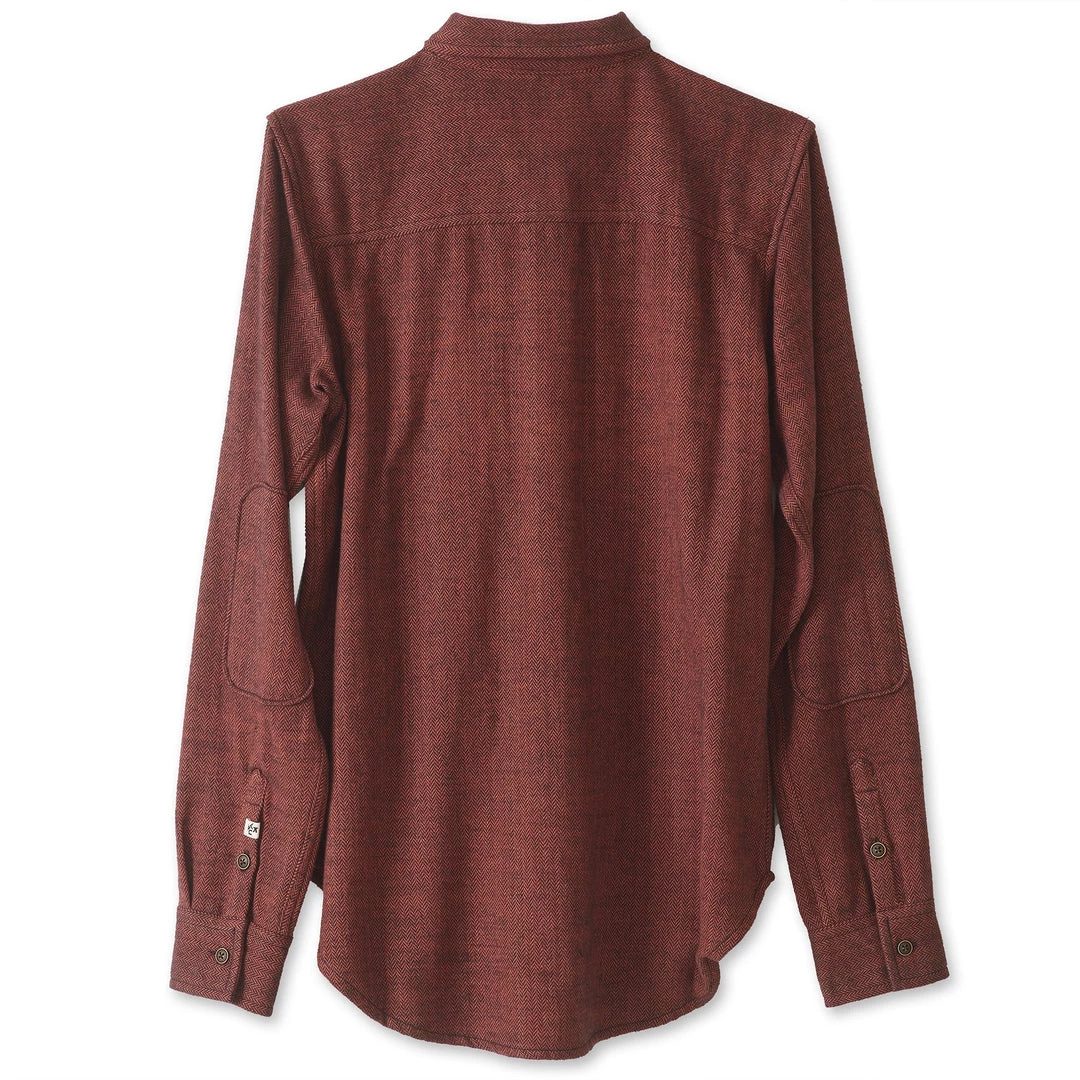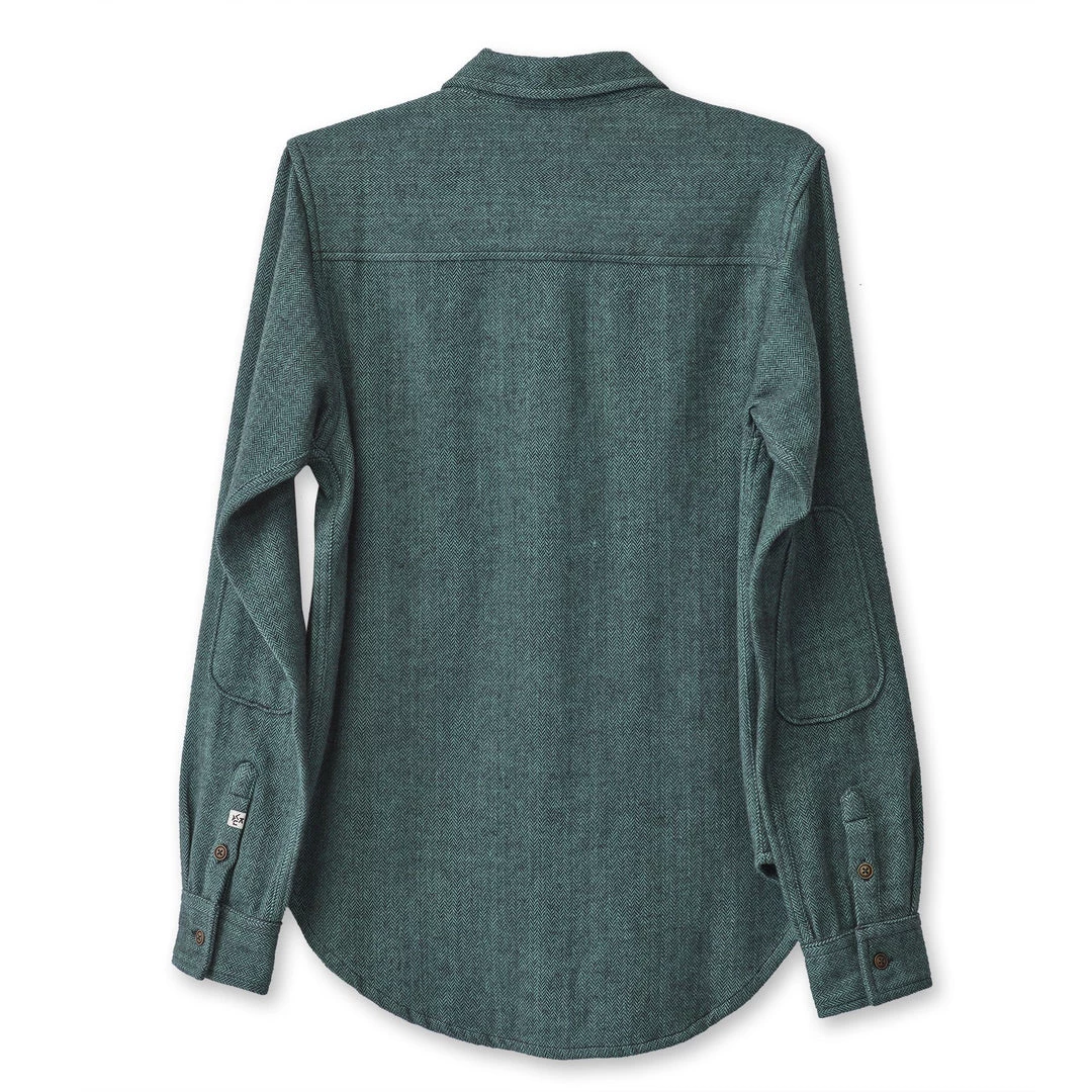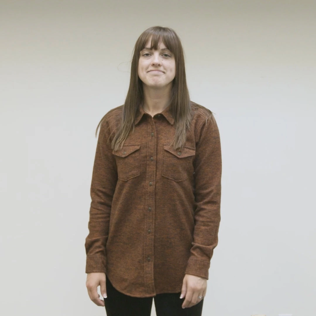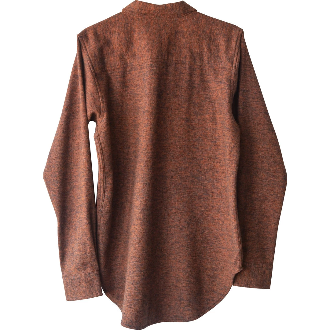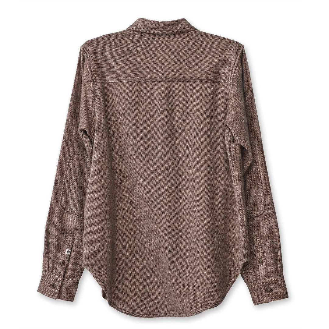 Boyfriend fit, long sleeve button up shirt, stand collar, two chest flap pockets, self fabric elbow patches, deep curved hem. So soft you won’t want to take it off but, thick enough to keep you cozy when you need it.