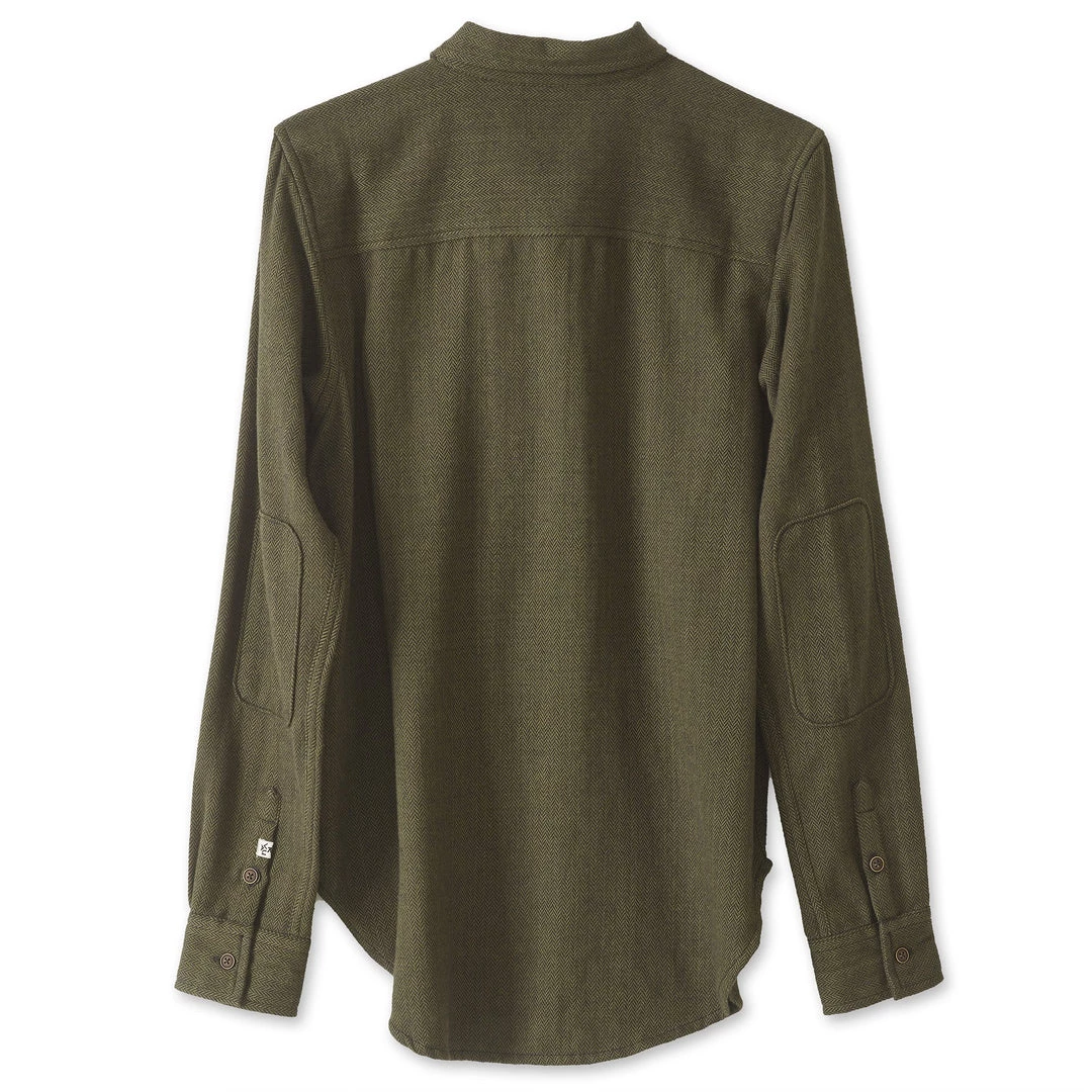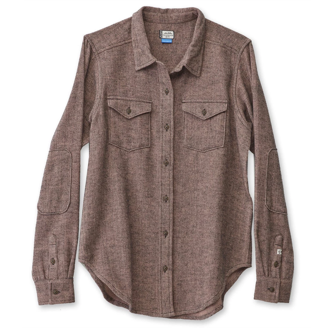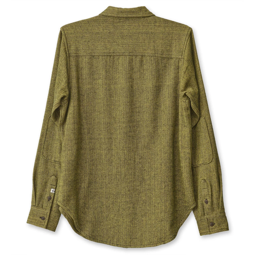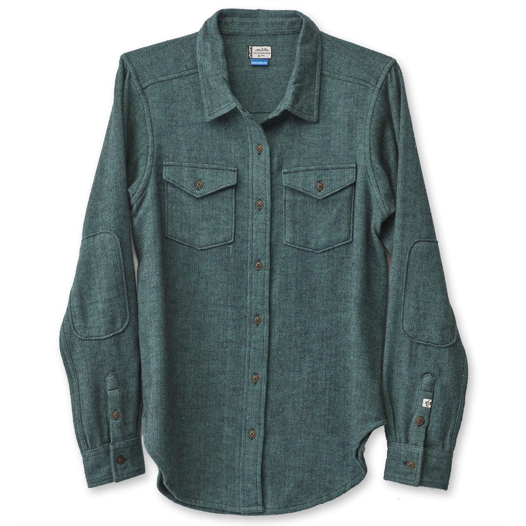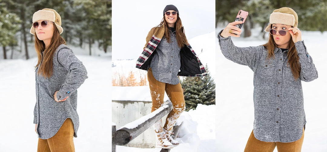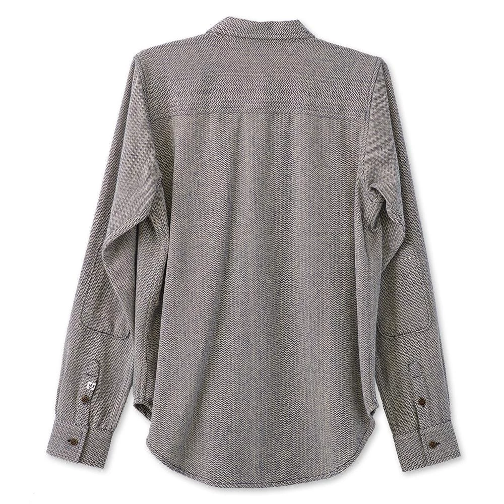 Boyfriend fit, long sleeve button up shirt, stand collar, two chest flap pockets, self fabric elbow patches, deep curved hem. So soft you won’t want to take it off but, thick enough to keep you cozy when you need it.