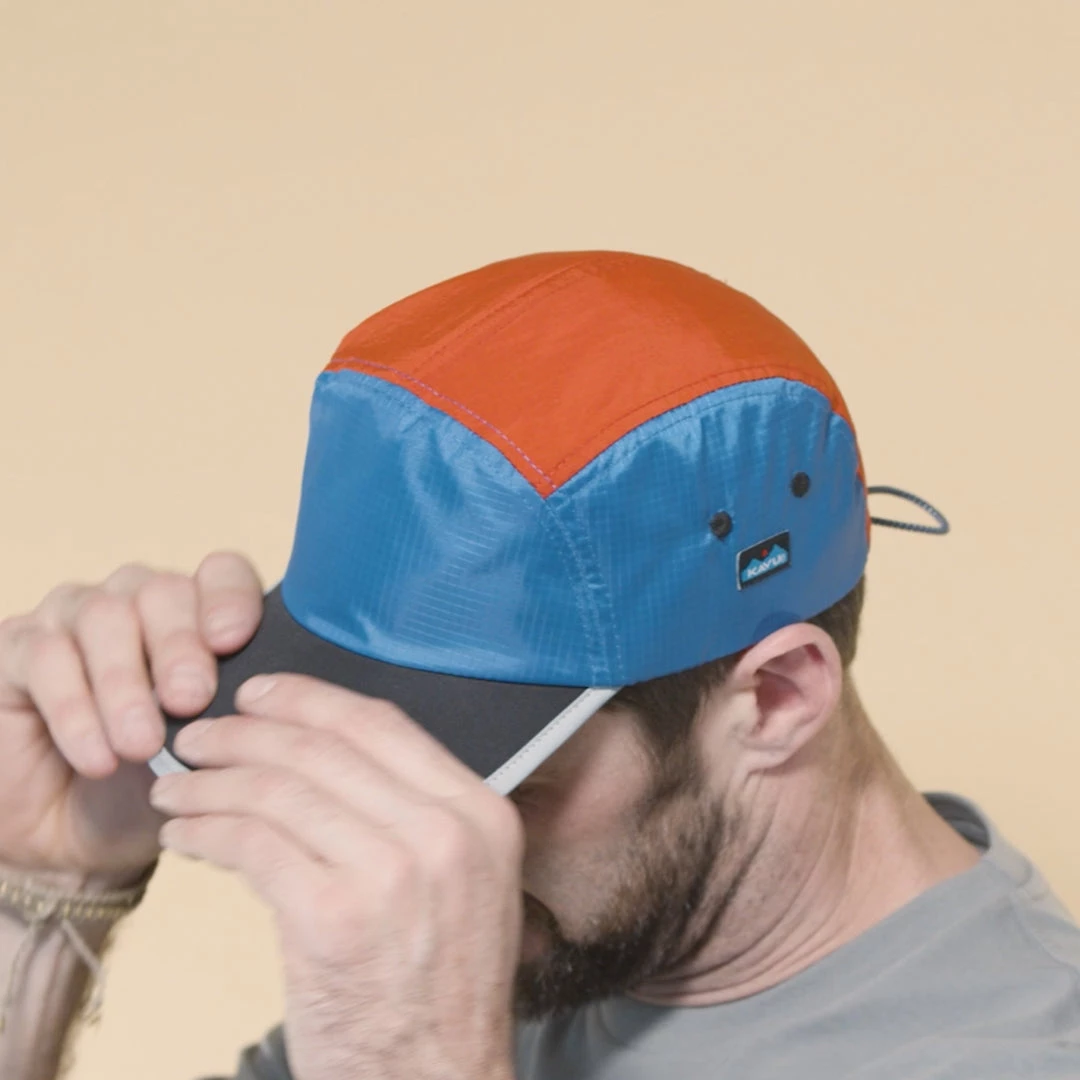 5 panel unstructured low profile KAVU specialty camp cap, slightly curved soft brim with reflective binding and back edge, contrast nylon ripstop front and side crown panels, nylon crepe top crown panels and bill, embroidered eyelets and logo label on side, back bungee and toggle adjustment.