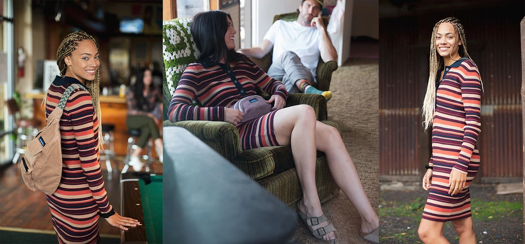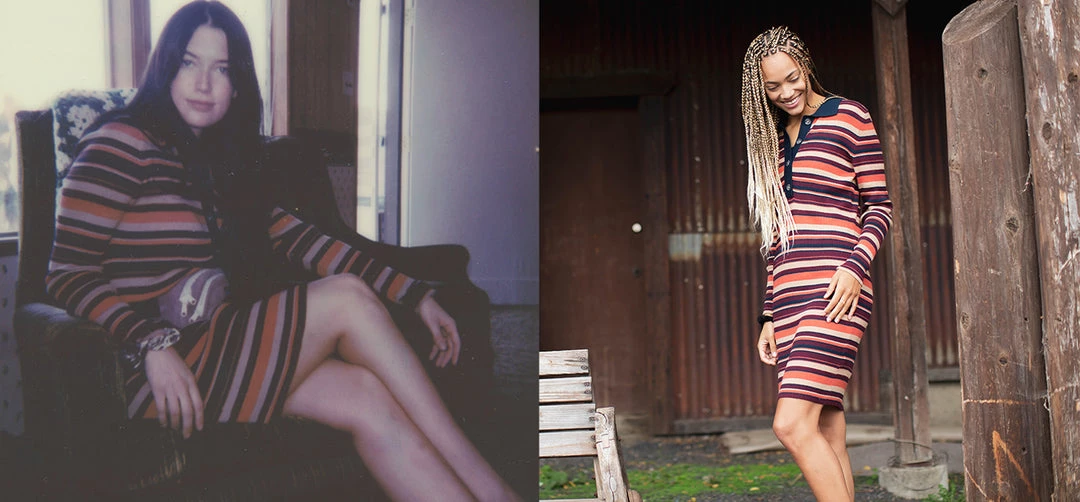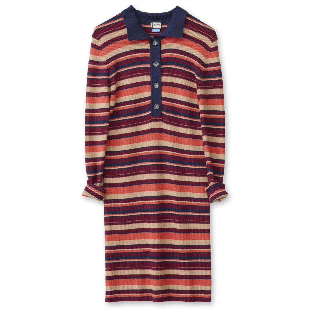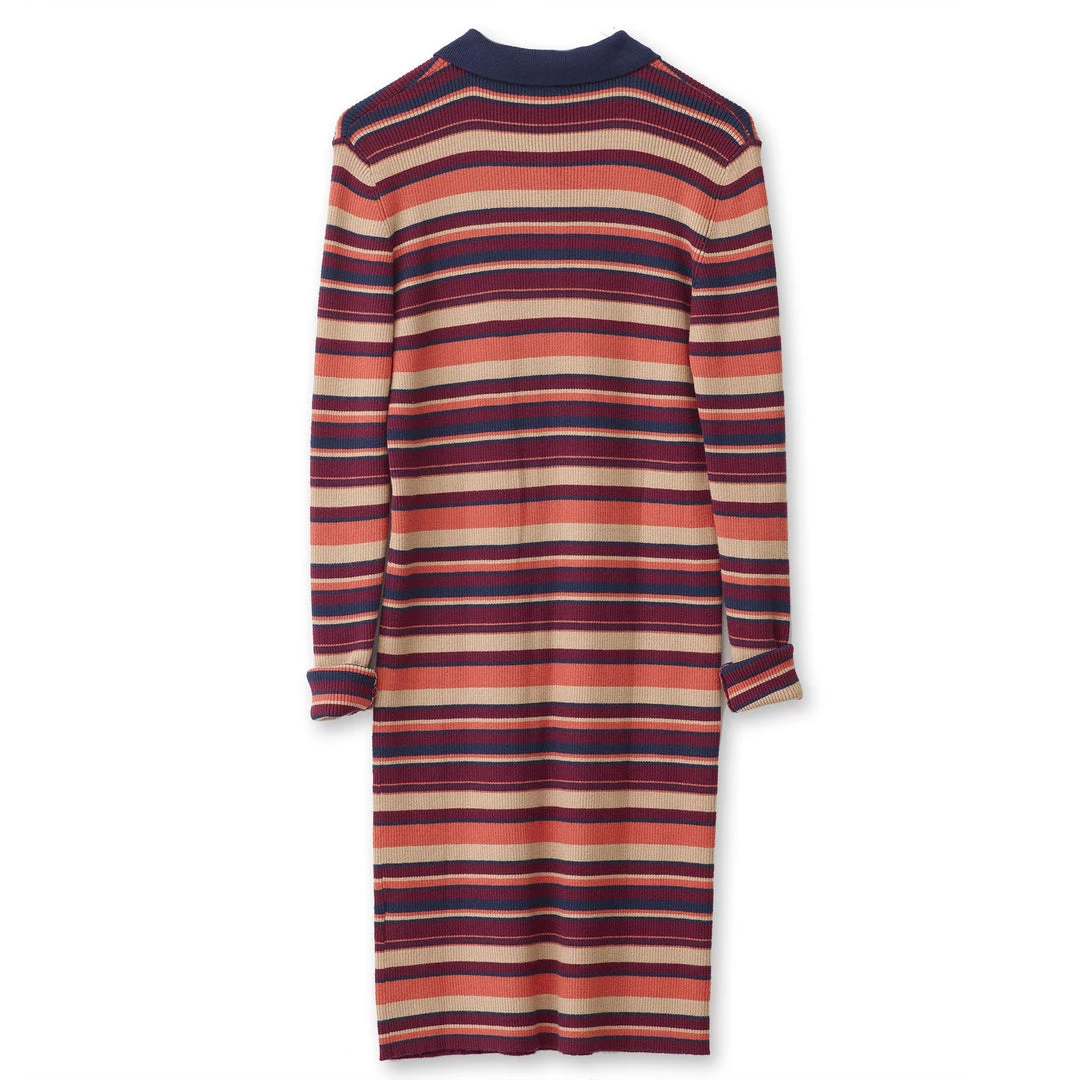 Formfitting, long sleeve sweater dress, ribbed collar and half button placket, straight hem, length hits at knee.