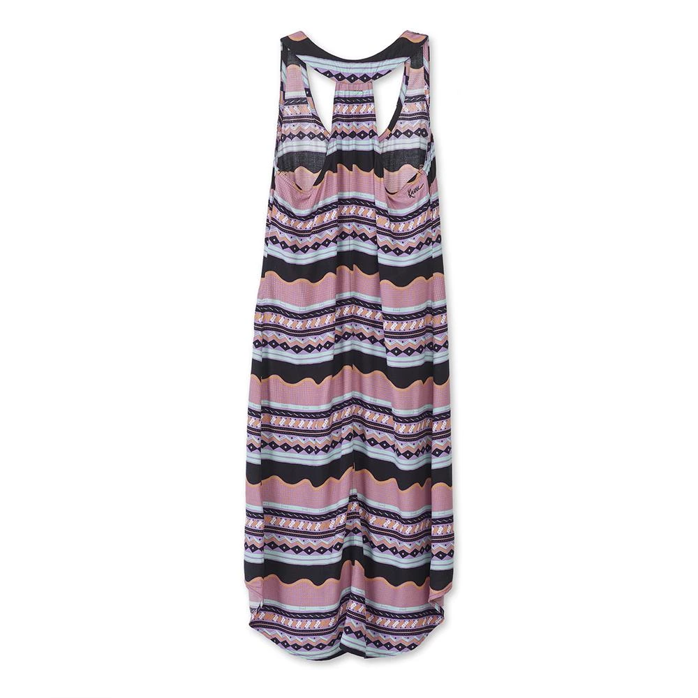 Free flow’n sleeveless dress, scoop neck, racer back styling, welt pocket, 6″ back hem drop, length hits between knee and back mid-calf.