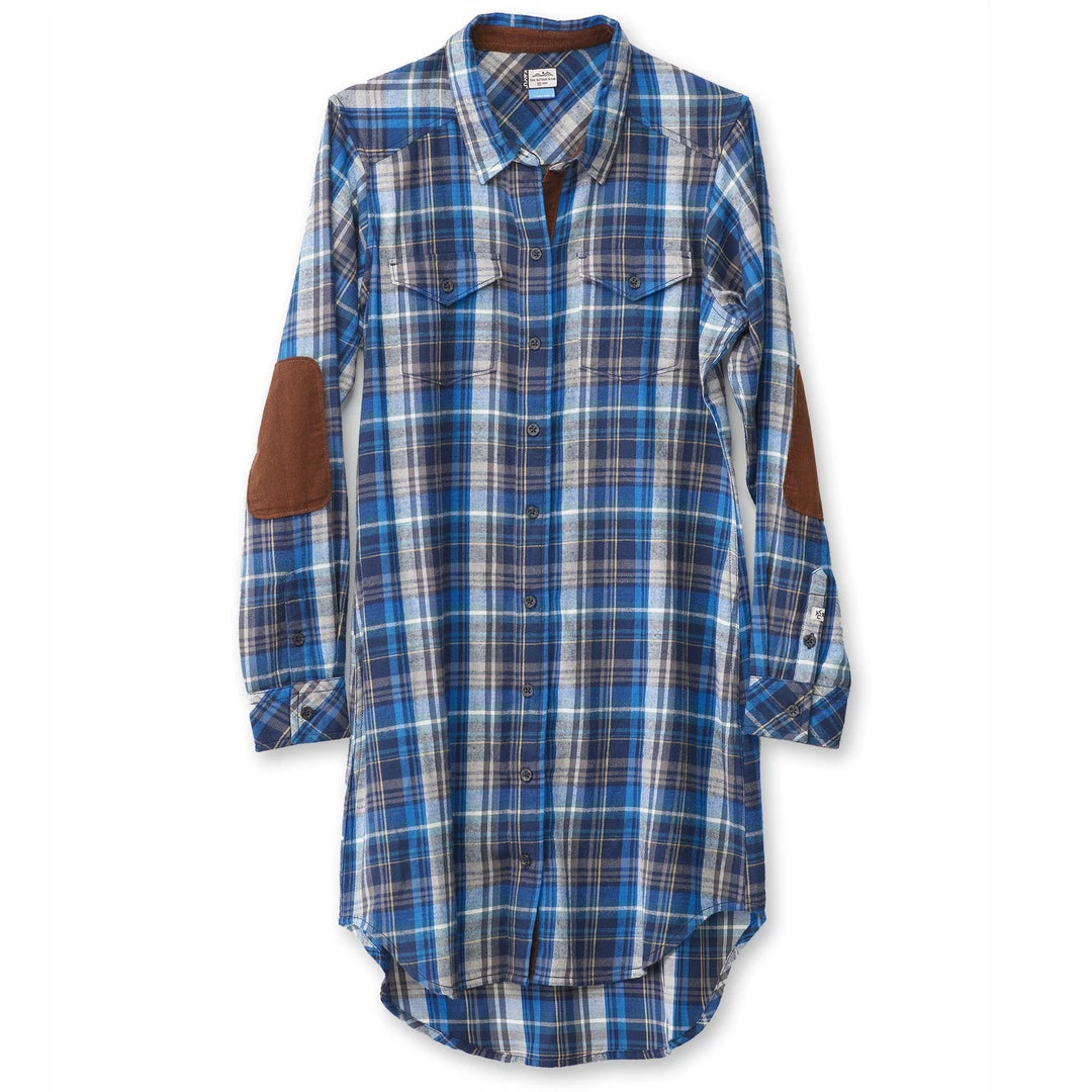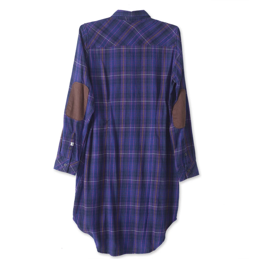 Semi-fitted, long sleeve button up shirt dress, stand collar, two chest flap pockets with button closure, corduroy elbow patches, deep curved hem, length hits between knee and back mid-calf.
