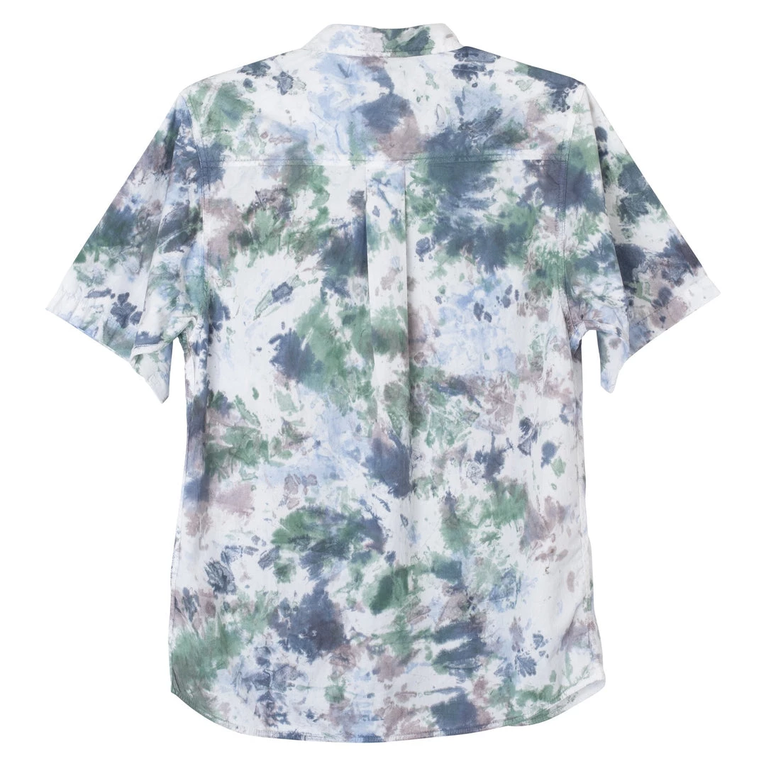 Casual fit, short sleeve button up hand tie dyed shirt, stand collar with self-fabric neck tape, single chest pocket with pen pocket, 25% certified recycled polyester faux wood buttons, back yoke panel with center back box pleat, curved hem.