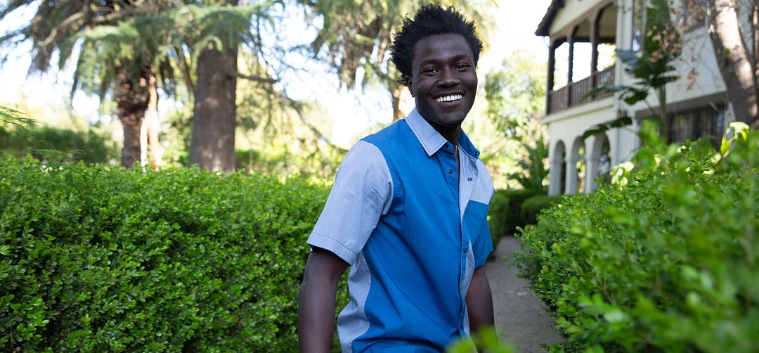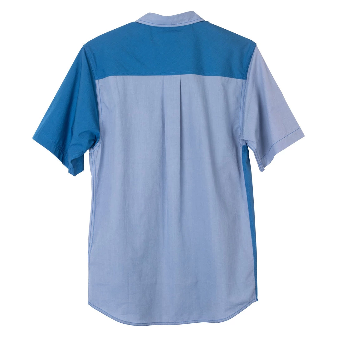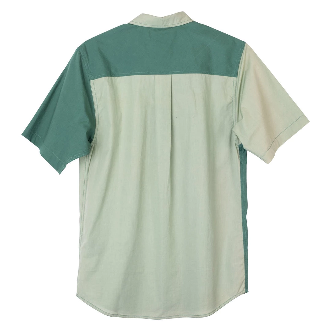 Casual fit, short sleeve button up color blocked shirt, stand collar with self-fabric neck tape, single chest pocket, polyester dyed to match pearlized snaps with satin finish, back yoke panel with center back box pleat, curved hem