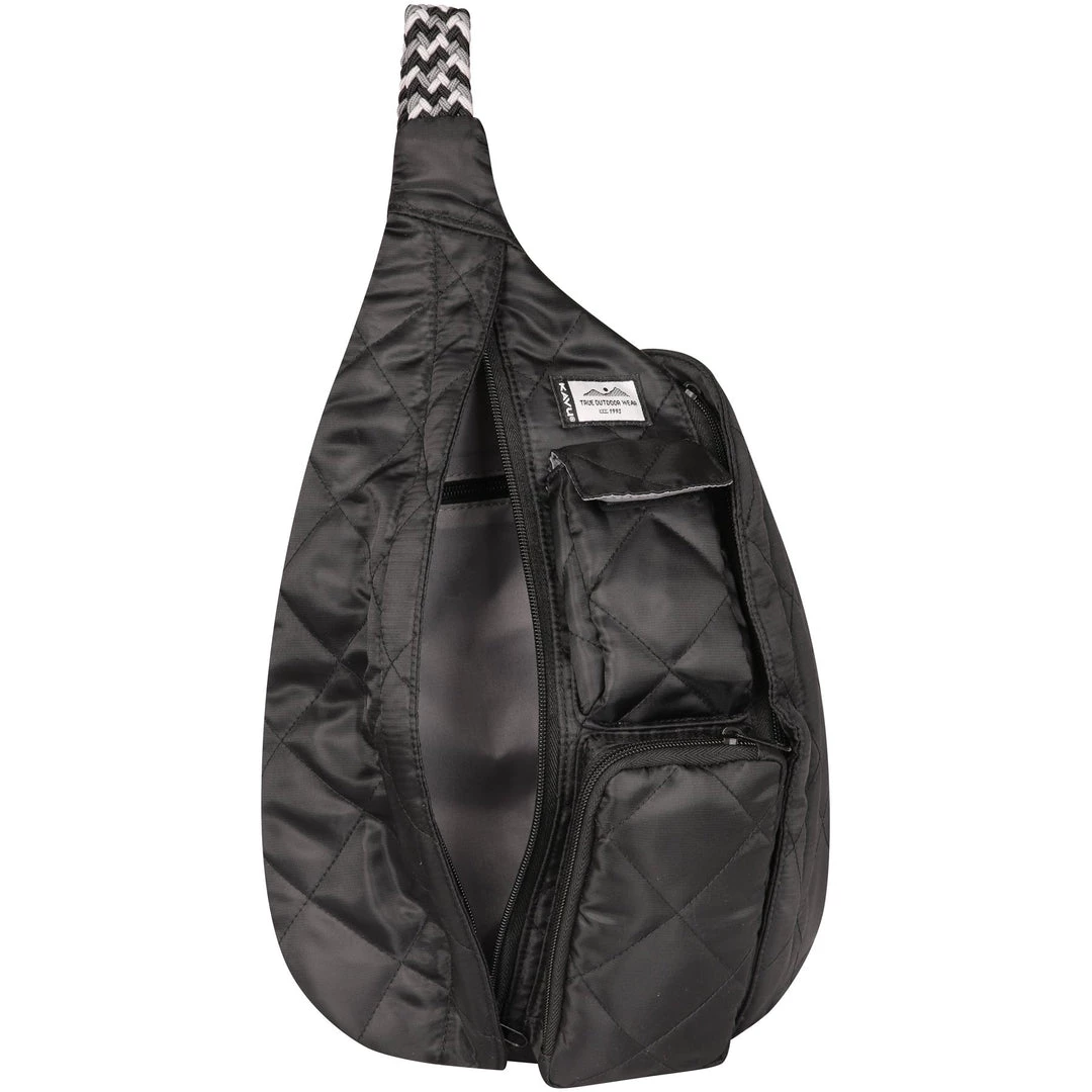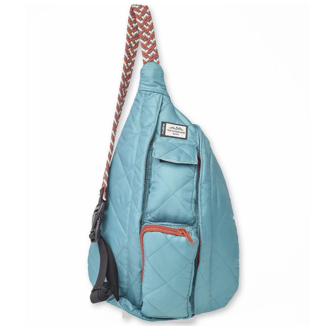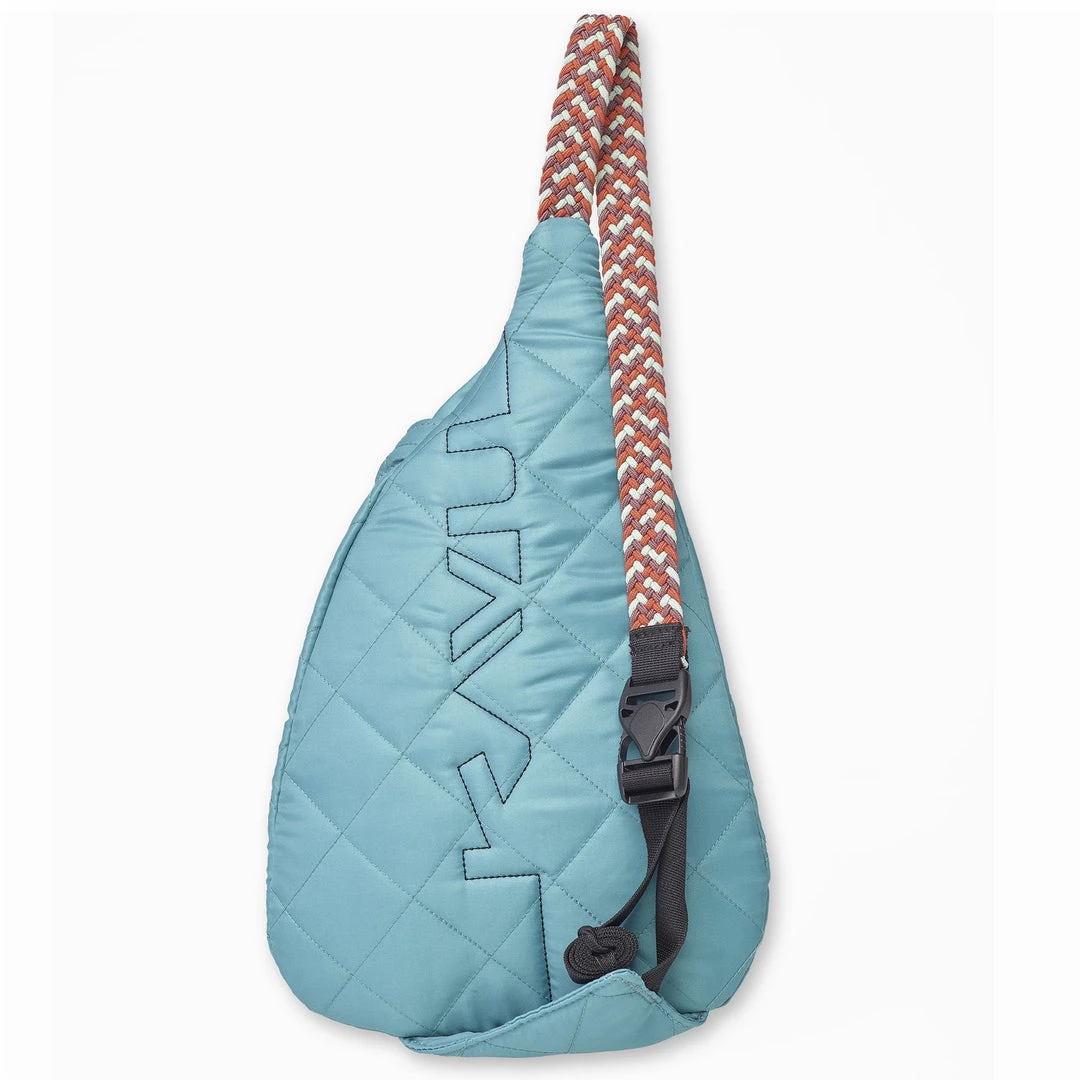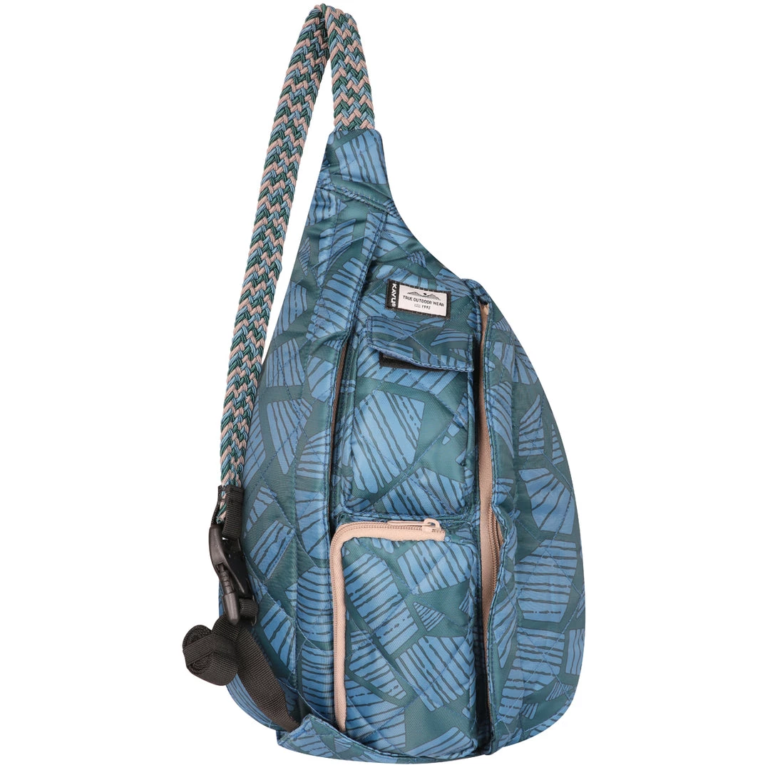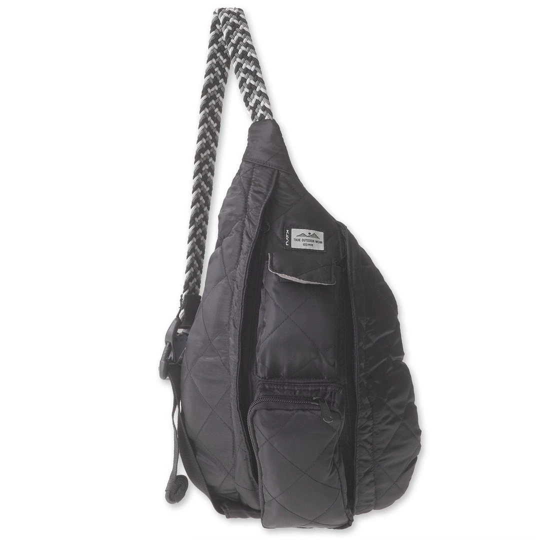 This diamond quilted mini sling pack features an adjustable braided elastic rope shoulder strap with side release buckle, two vertical zip compartments, two key or cell phone pockets, padded back with KAVU embroidery.