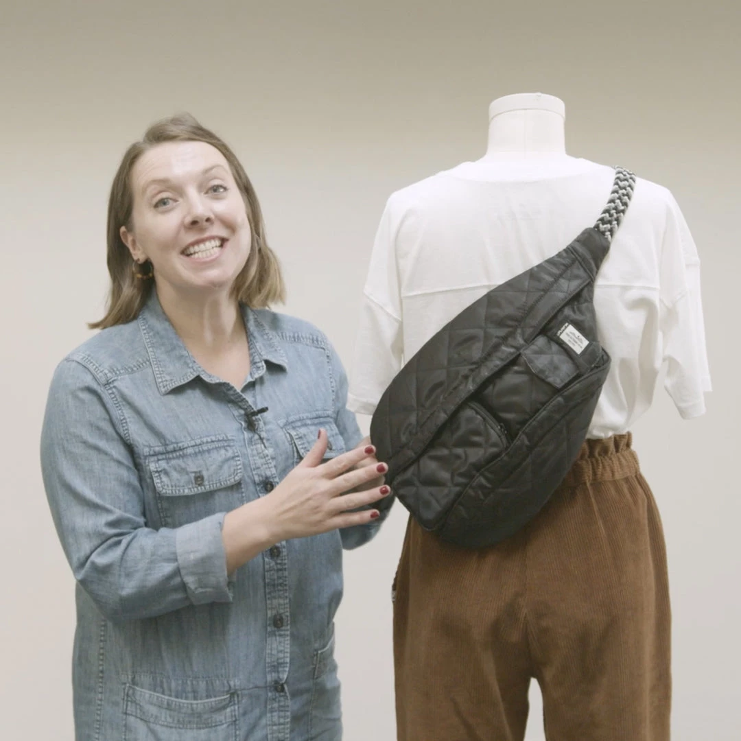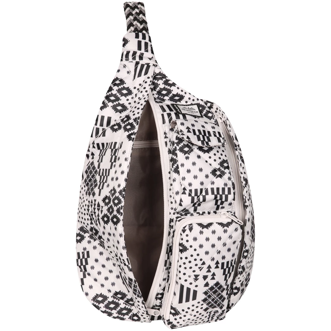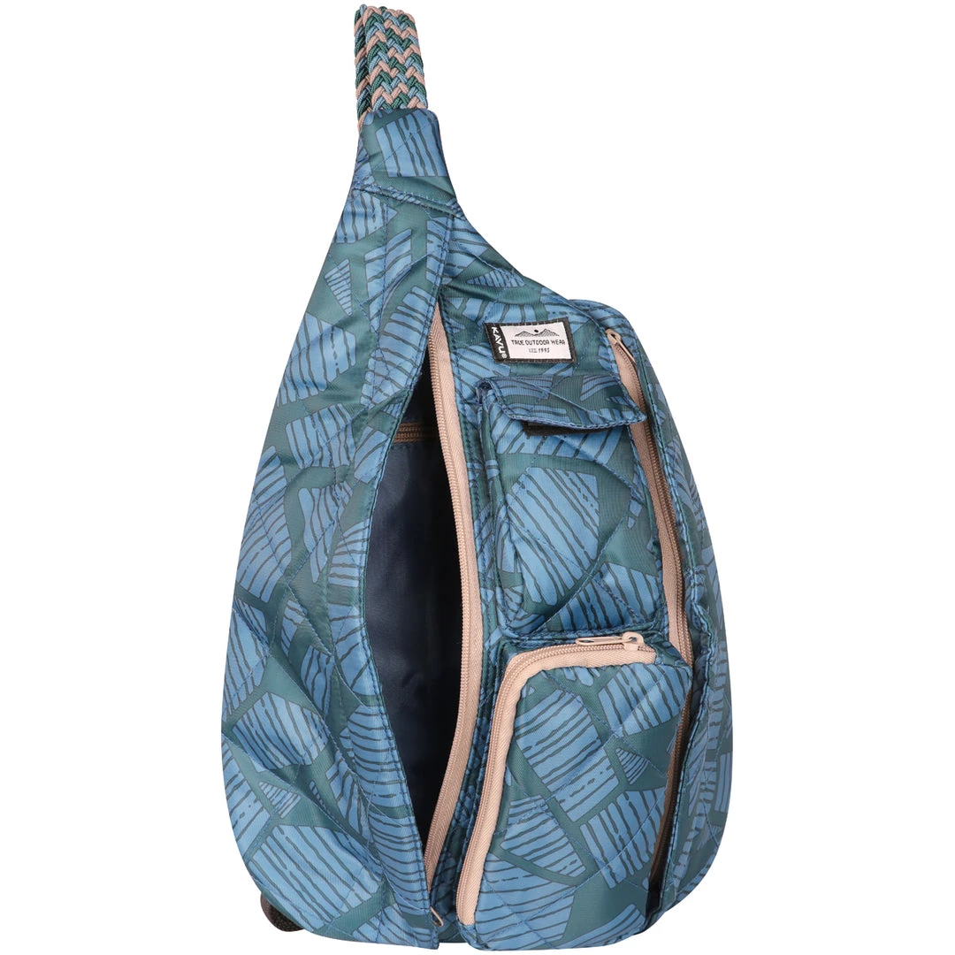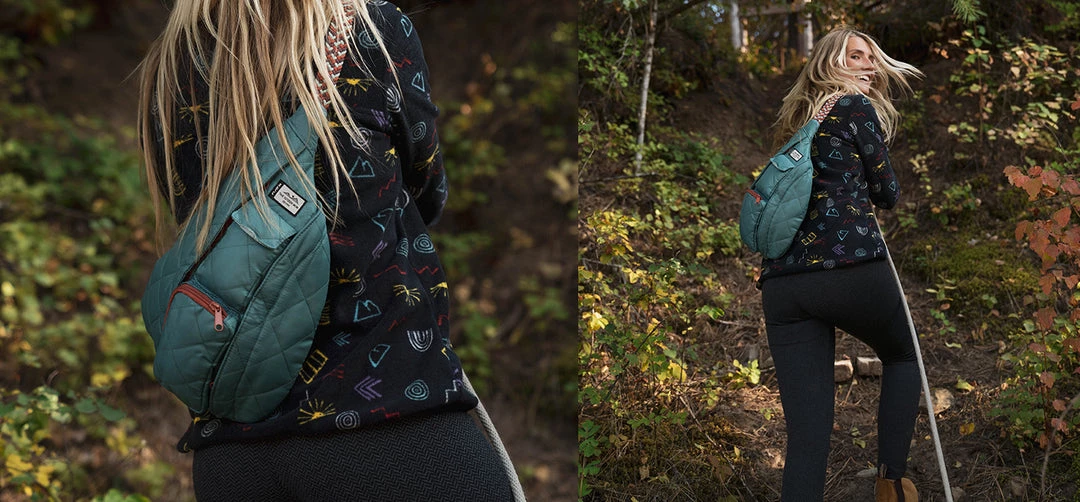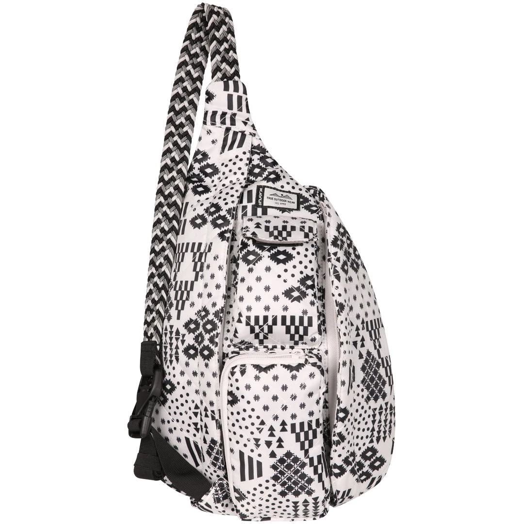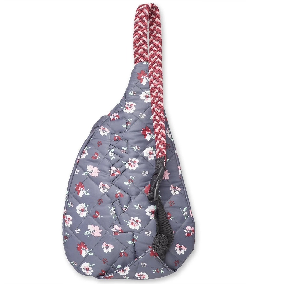 This diamond quilted mini sling pack features an adjustable braided elastic rope shoulder strap with side release buckle, two vertical zip compartments, two key or cell phone pockets, padded back with KAVU embroidery.