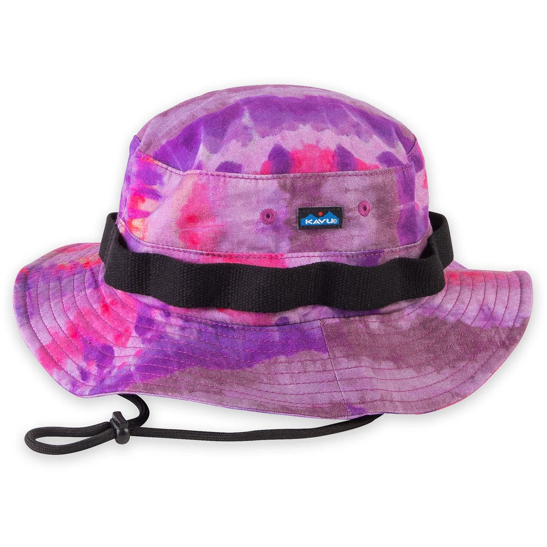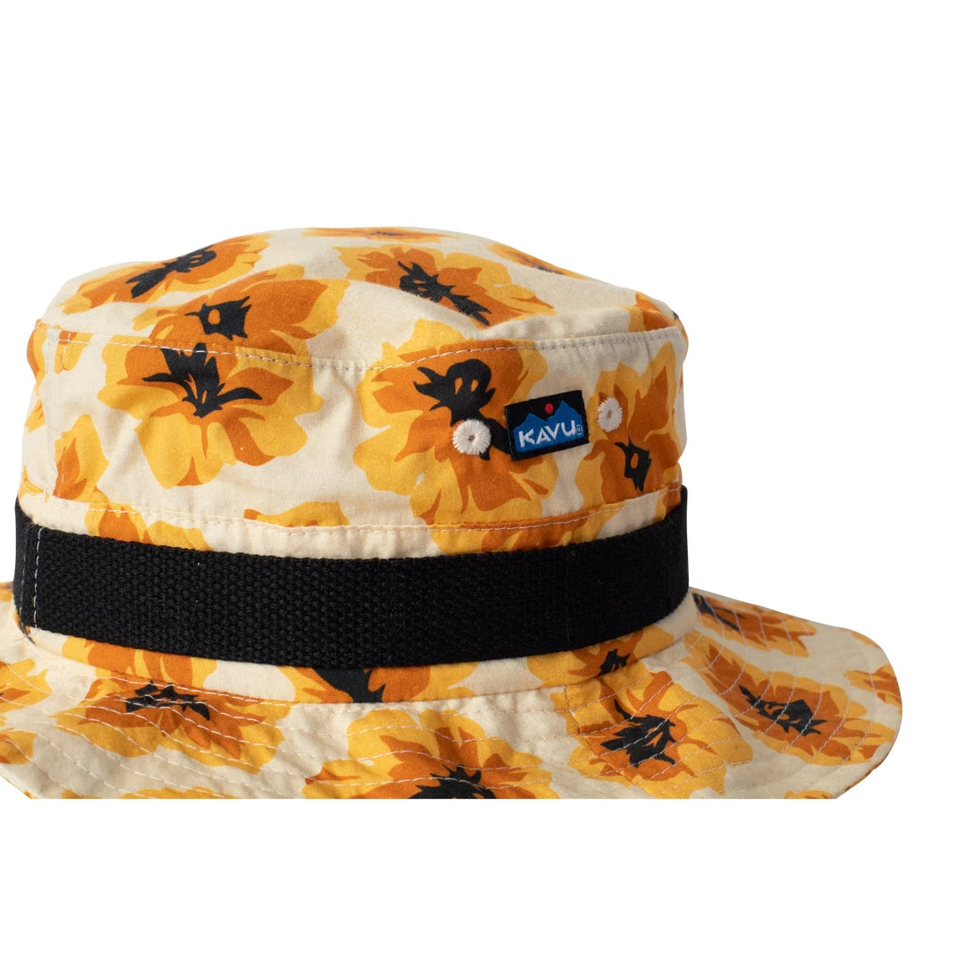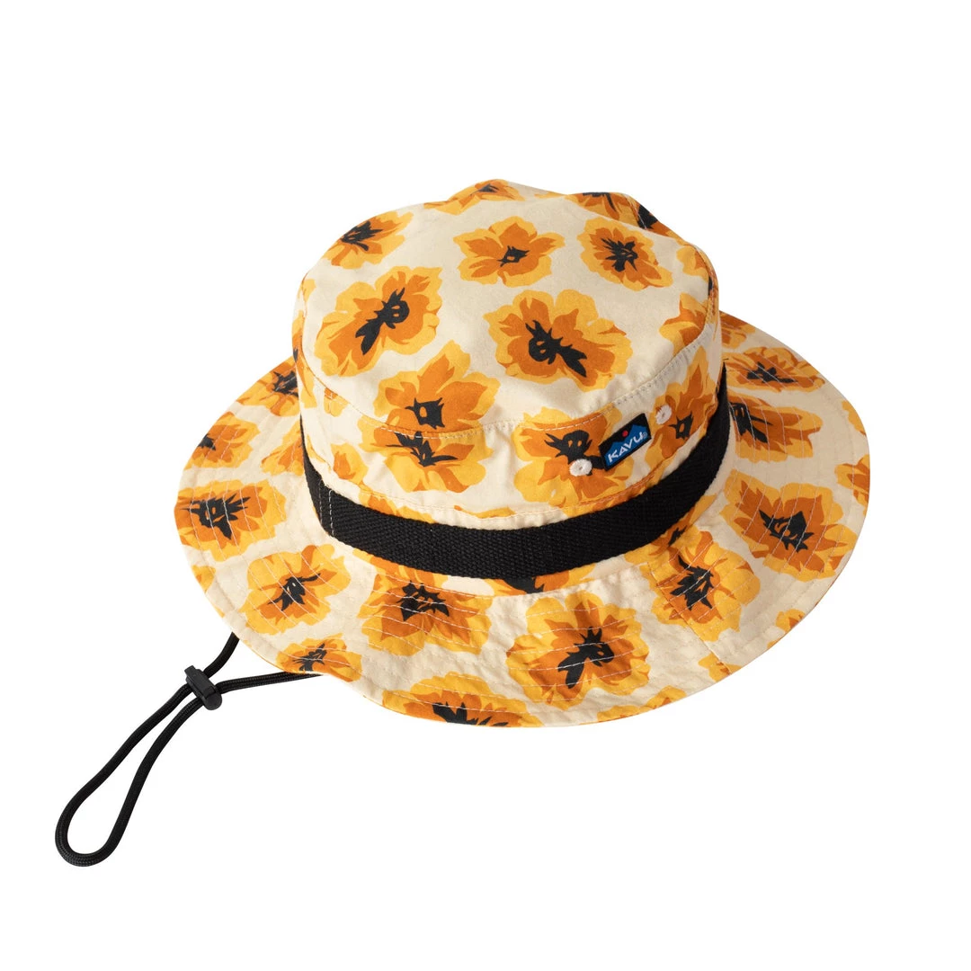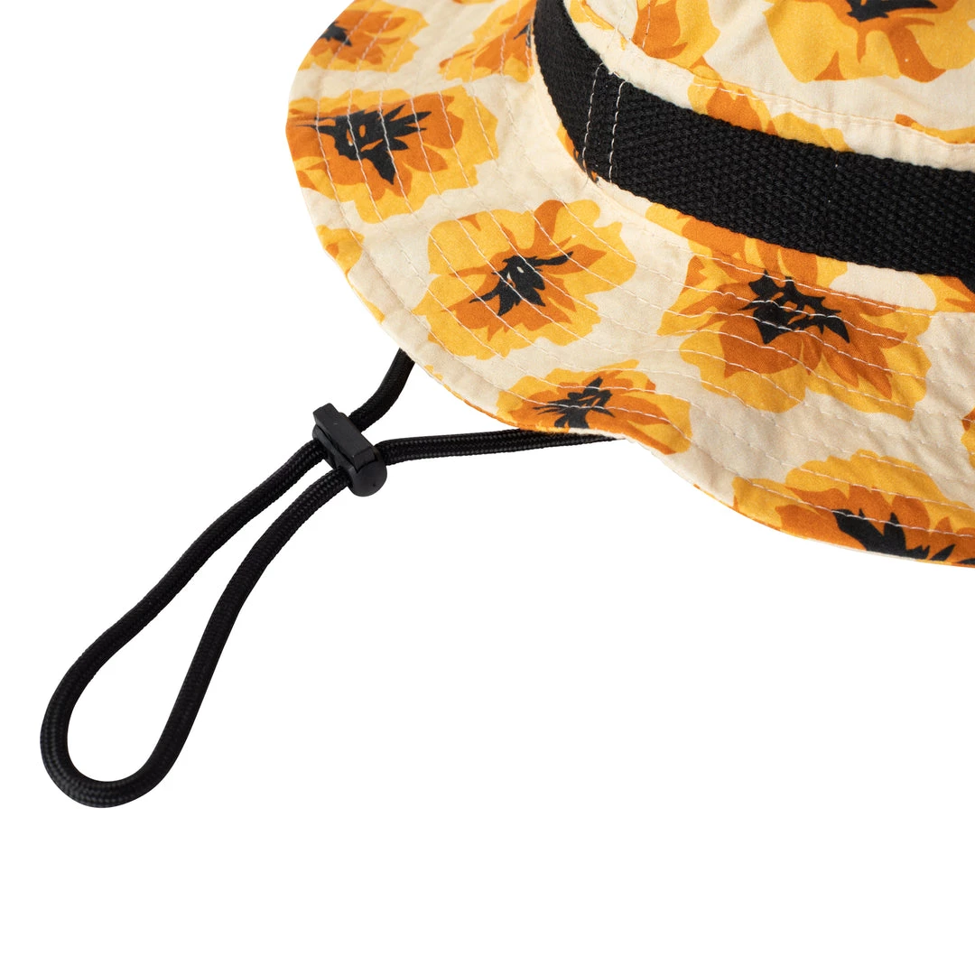 All over printed boonie, logo label at side, embroidered eyelets, pieced self-fabric band, floppy brim, adjustable chinstrap with cord lock, interior taping and moisture absorbing sweatband.