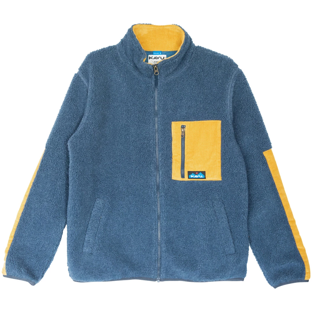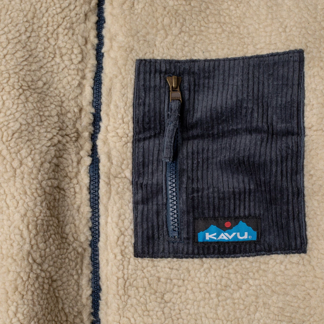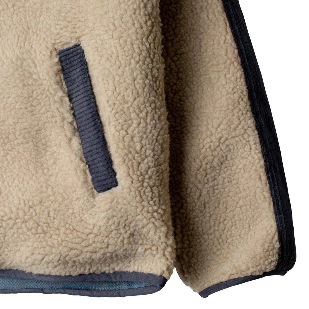 Casual fit, full zip mock neck Sherpa fleece jacket, corduroy pieced chest zip pocket, elbow patches, and inside facing, hand pockets, pop colored elastic binding on sleeve cuffs and bottom opening and zip pulls.