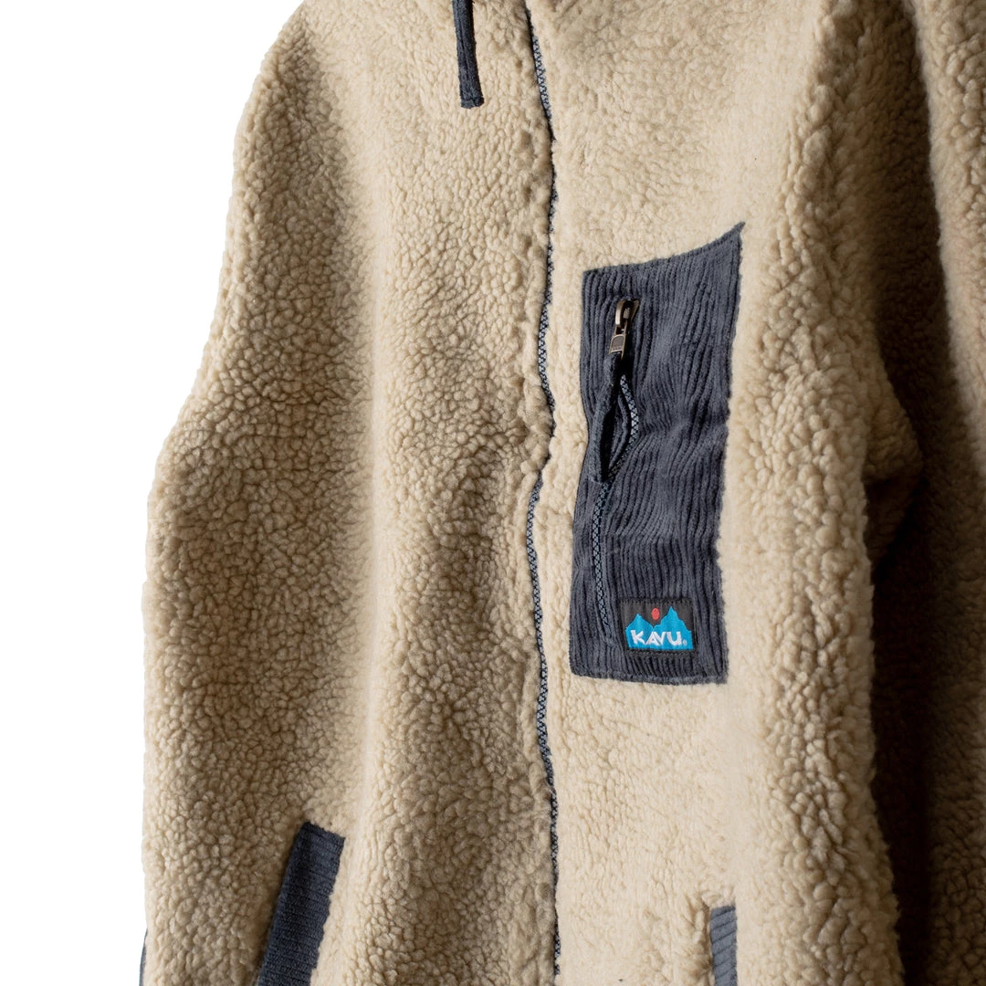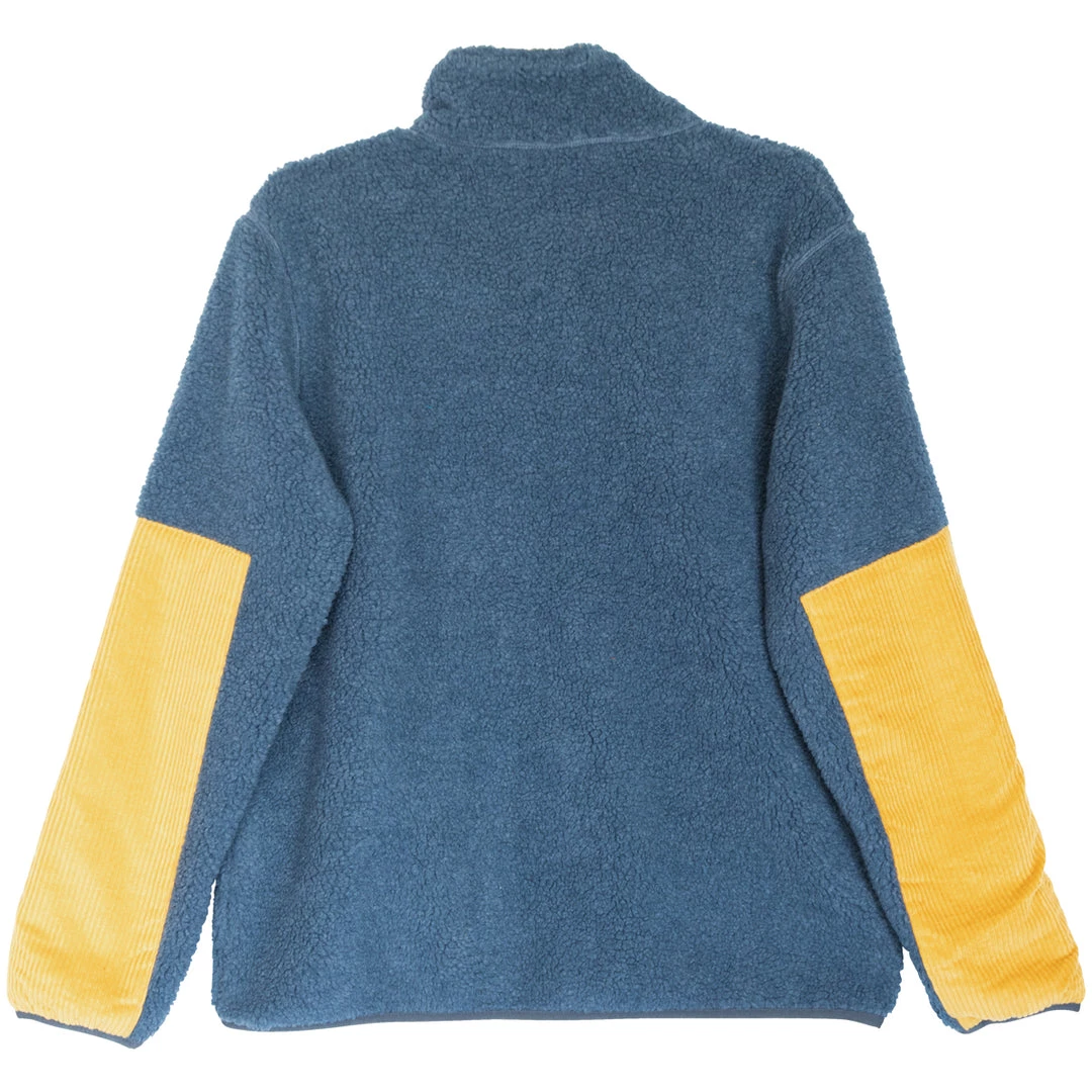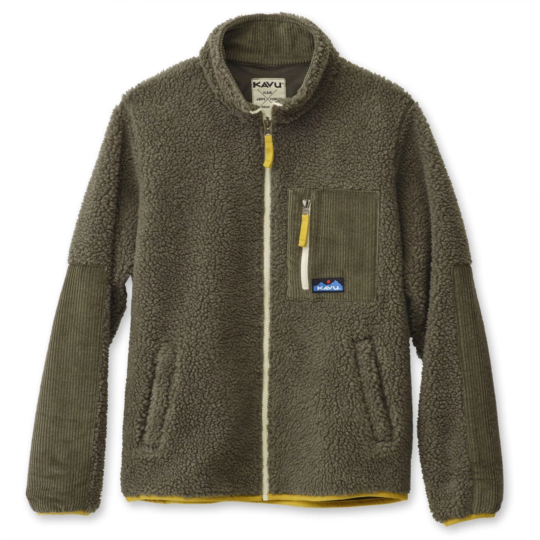 Casual fit, full zip mock neck Sherpa fleece jacket, corduroy pieced chest zip pocket, elbow patches, and inside facing, hand pockets, pop colored elastic binding on sleeve cuffs and bottom opening and zip pulls.