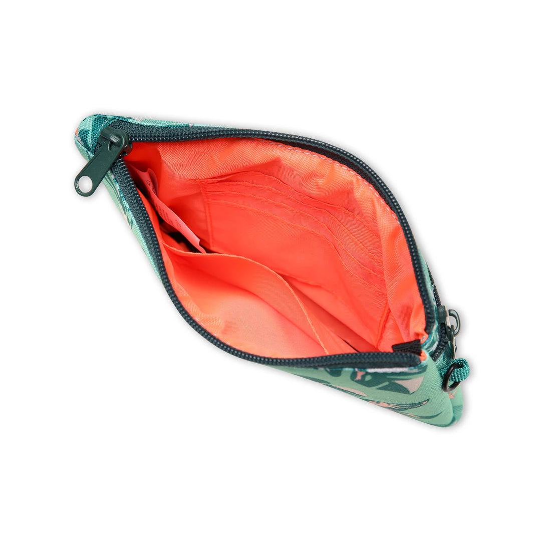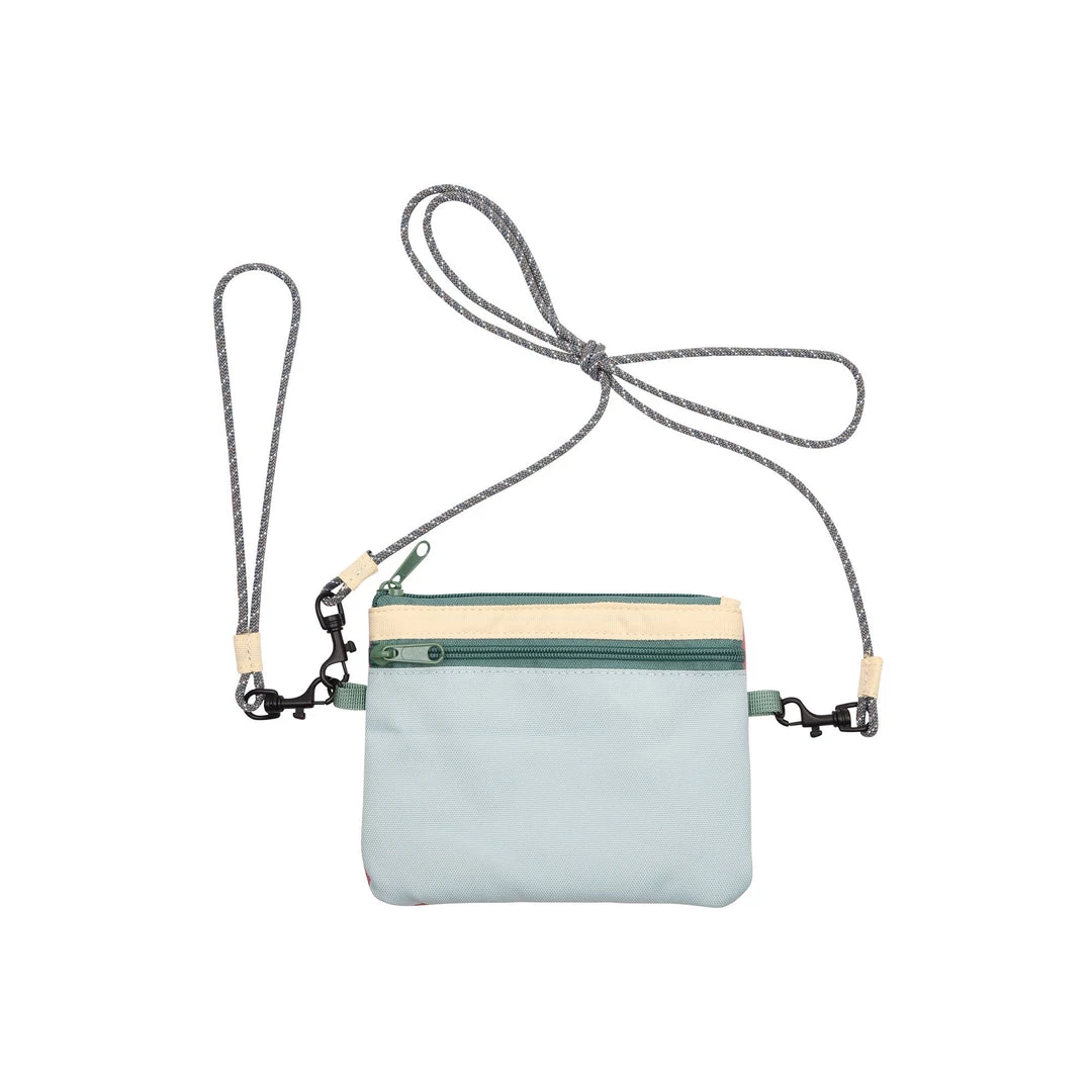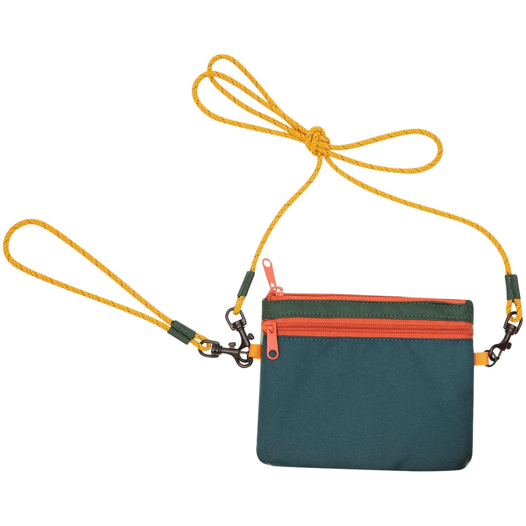 Cross body wallet, fixed rope wrist and shoulder strap that can detach with metal spring hook hardware, main compartment with zip closure and multiple cash and card slots, back exterior zip pocket.