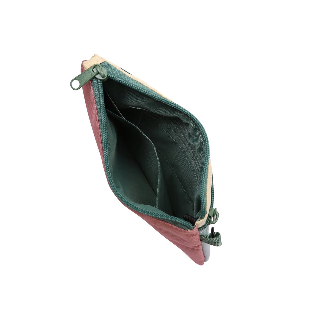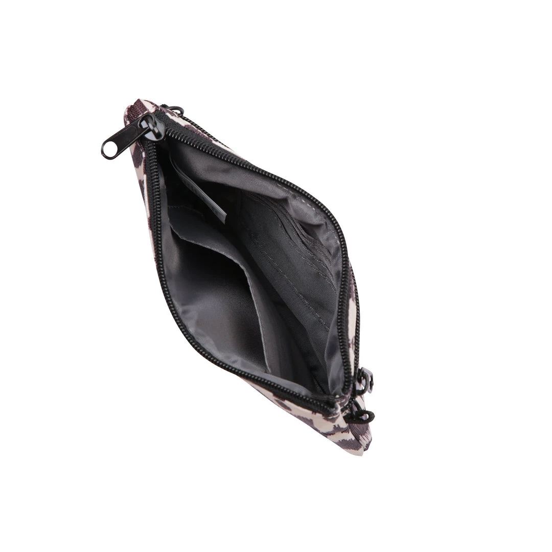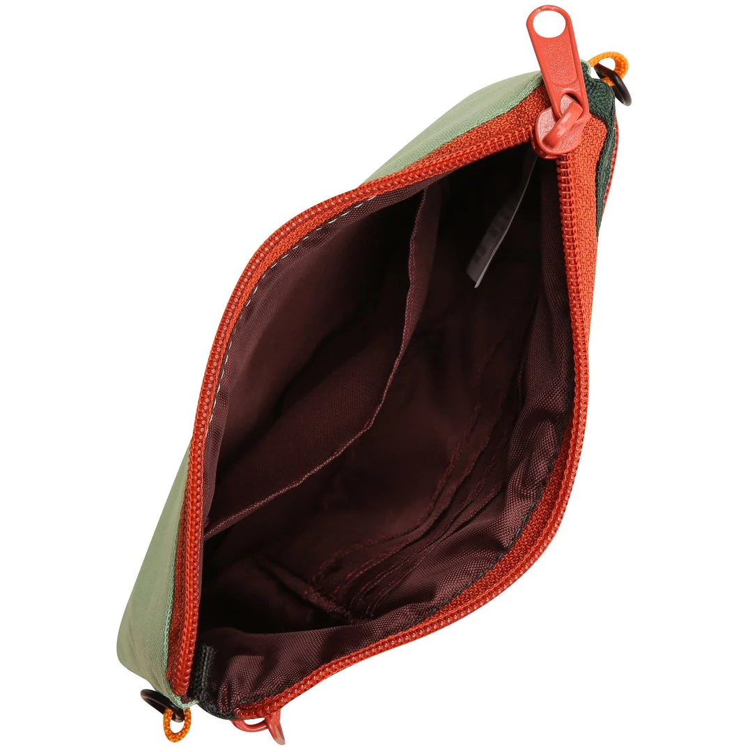 Cross body wallet, fixed rope wrist and shoulder strap that can detach with metal spring hook hardware, main compartment with zip closure and multiple cash and card slots, back exterior zip pocket.