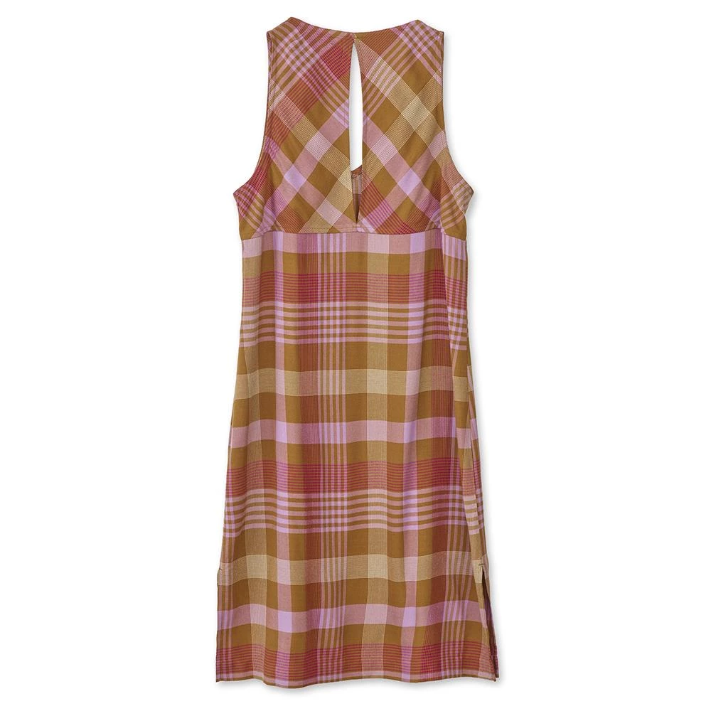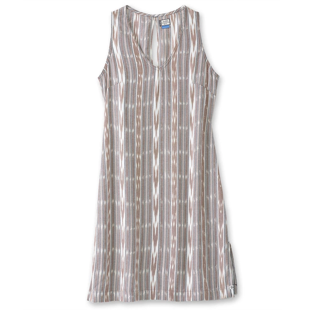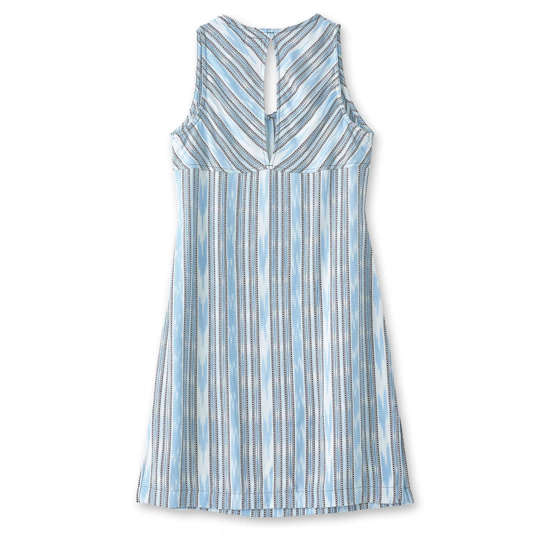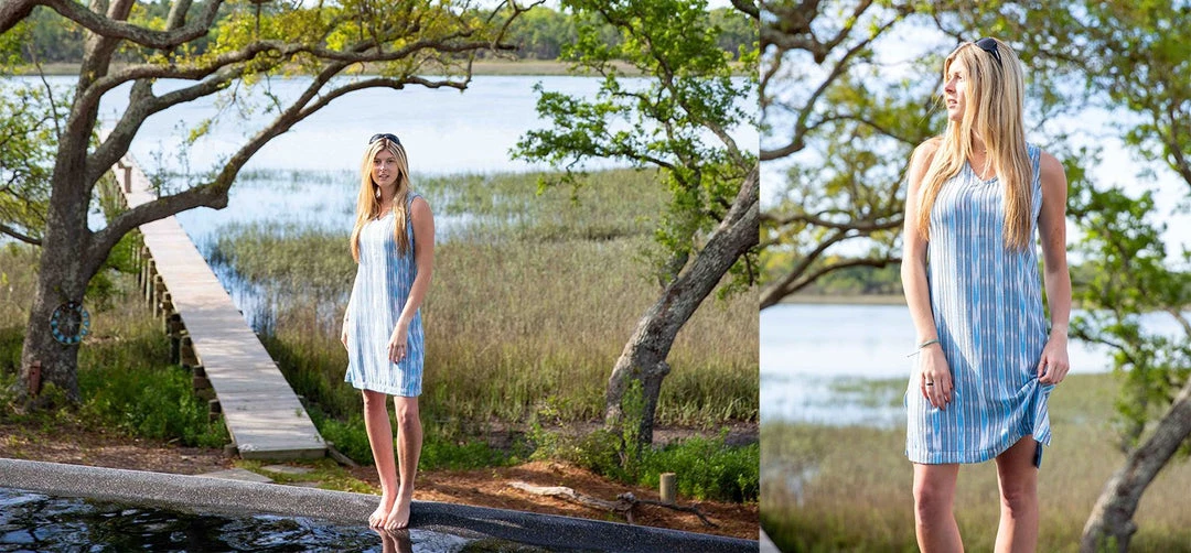 Semi-fitted sleeveless dress, v-neckline, back yoke slit detail, straight hem with side slits, length hits between knee and mid-calf.