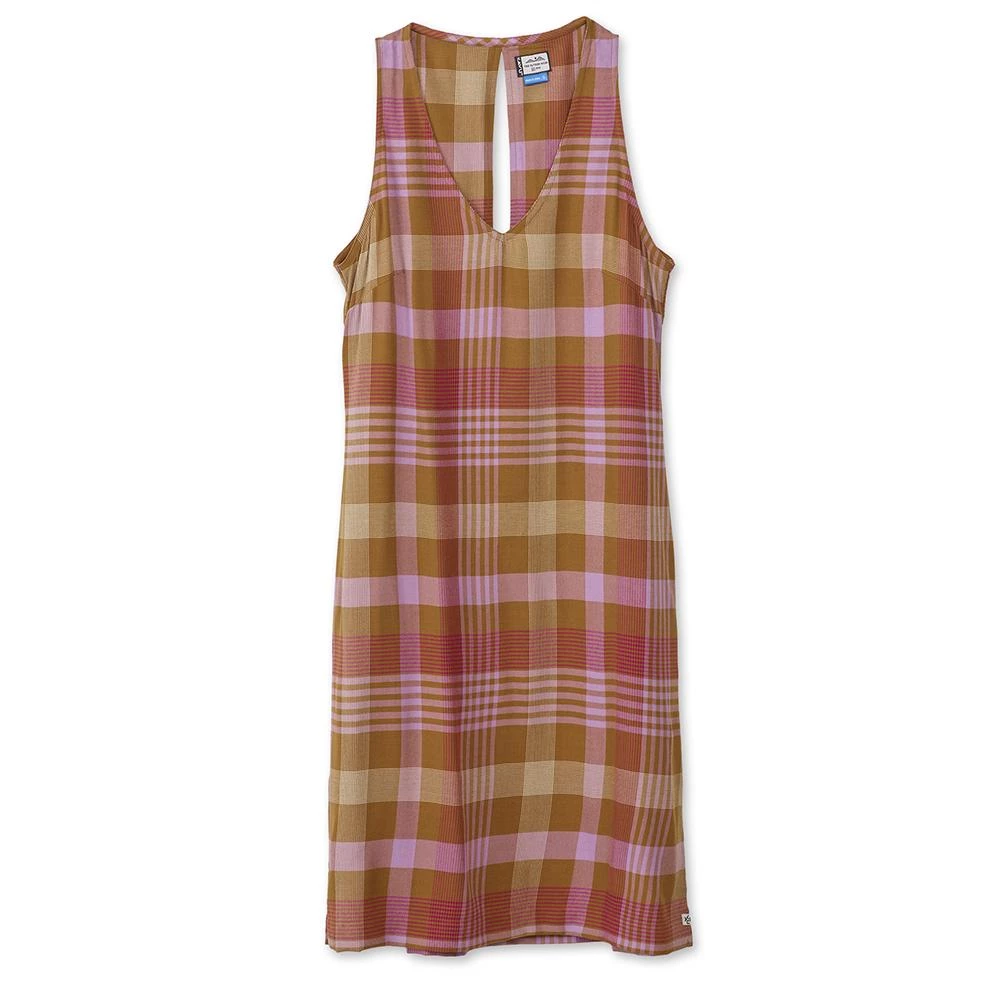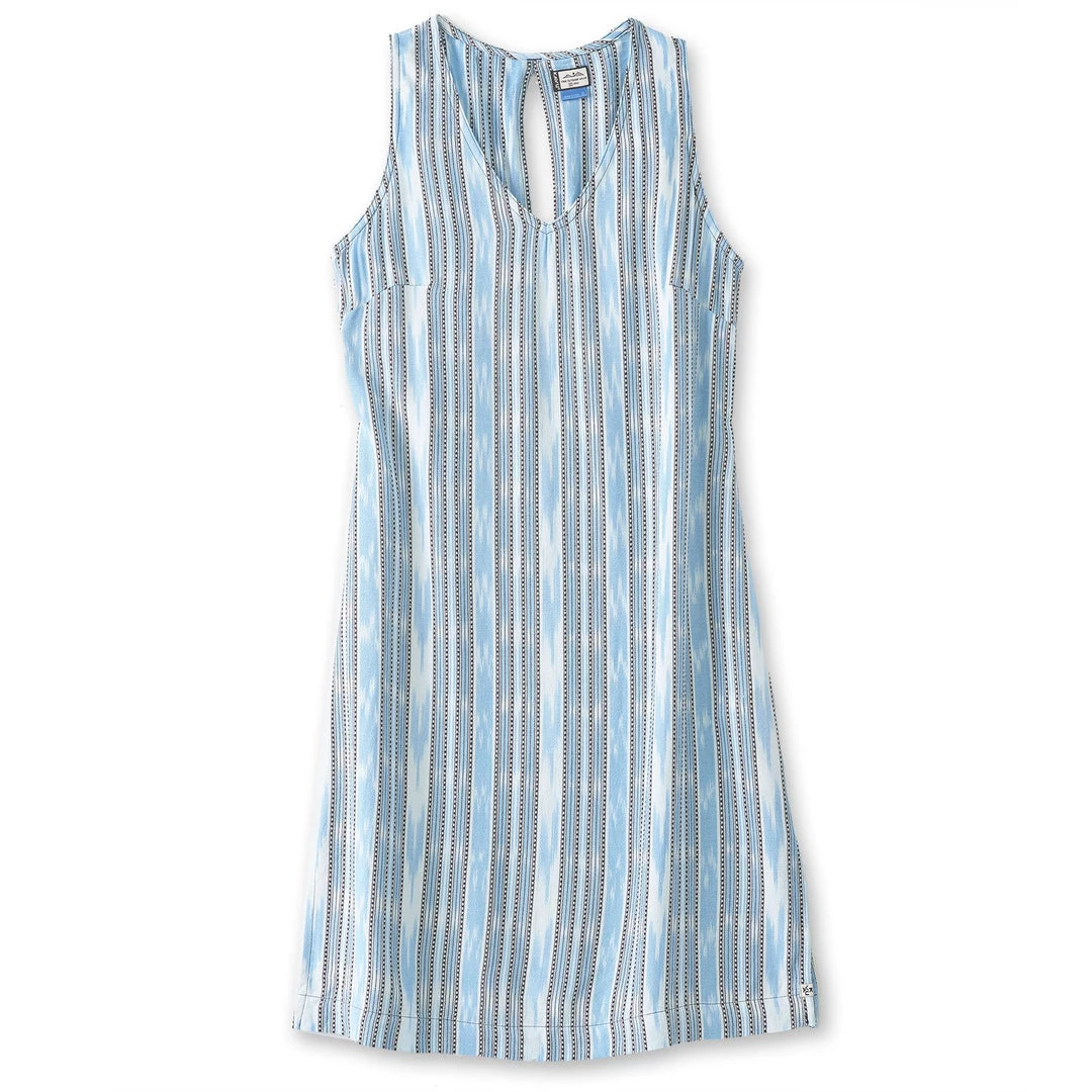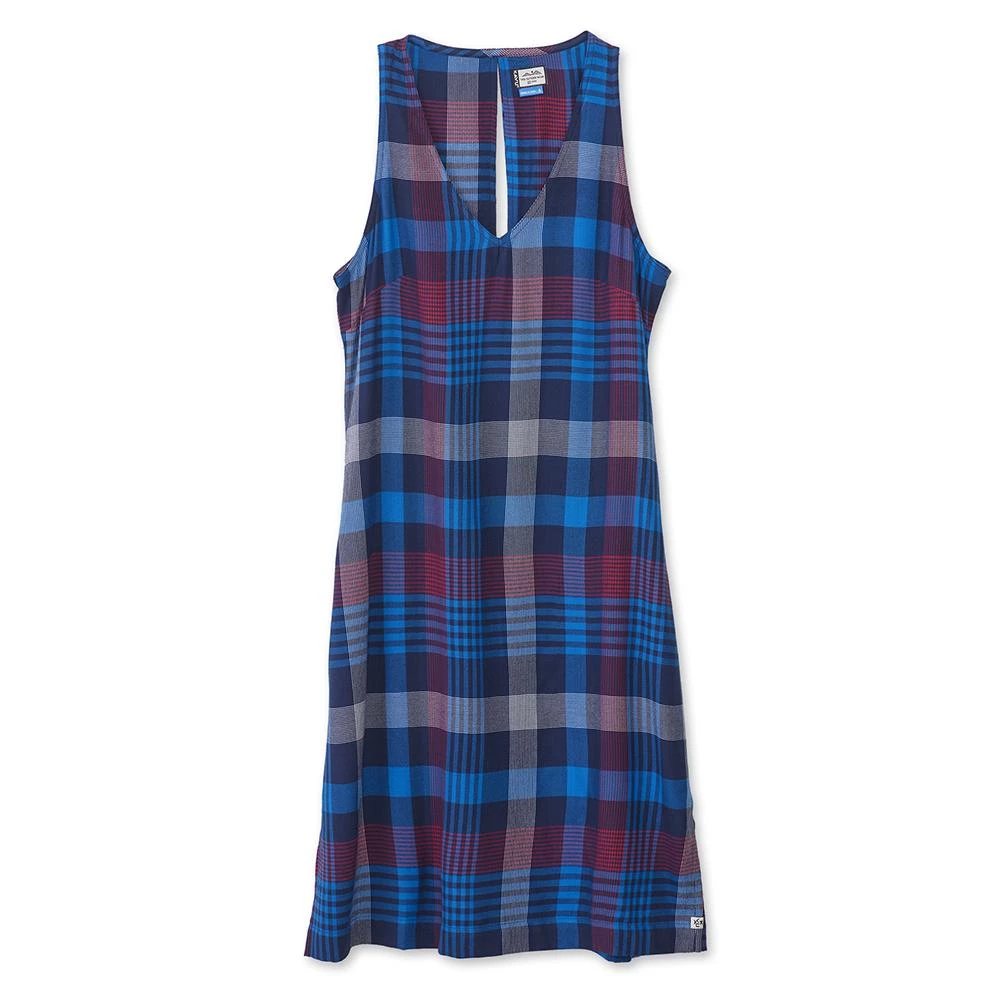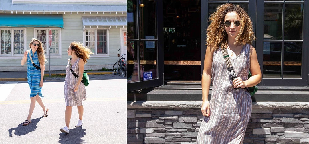 Semi-fitted sleeveless dress, v-neckline, back yoke slit detail, straight hem with side slits, length hits between knee and mid-calf.