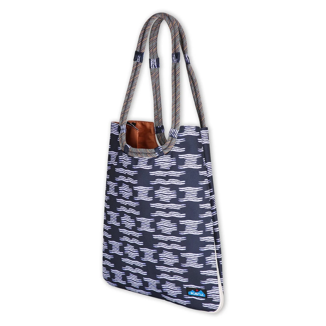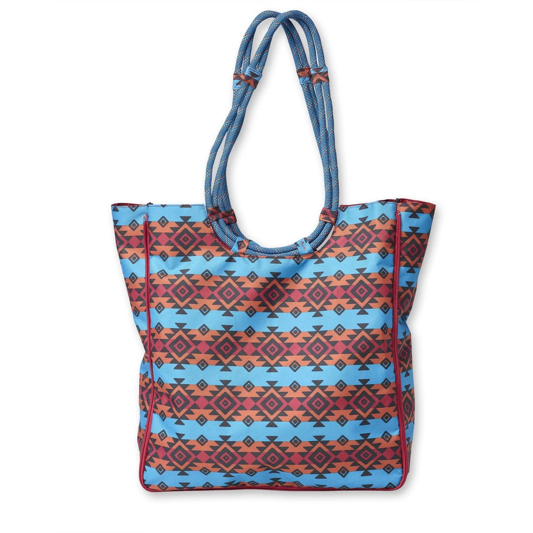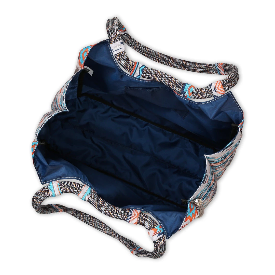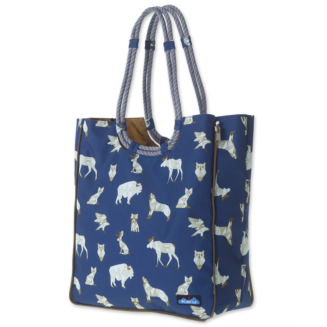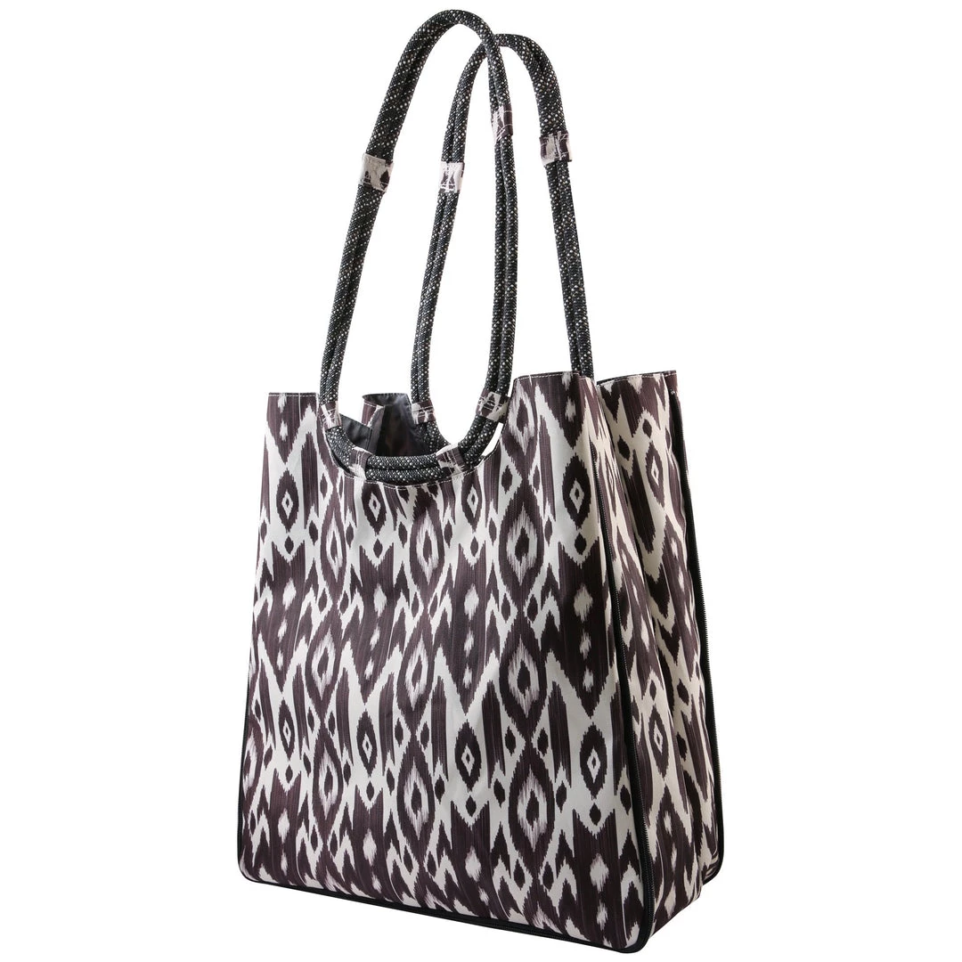 This large tote grocery-getter has fixed rope shoulder straps and one large expandable main compartment.