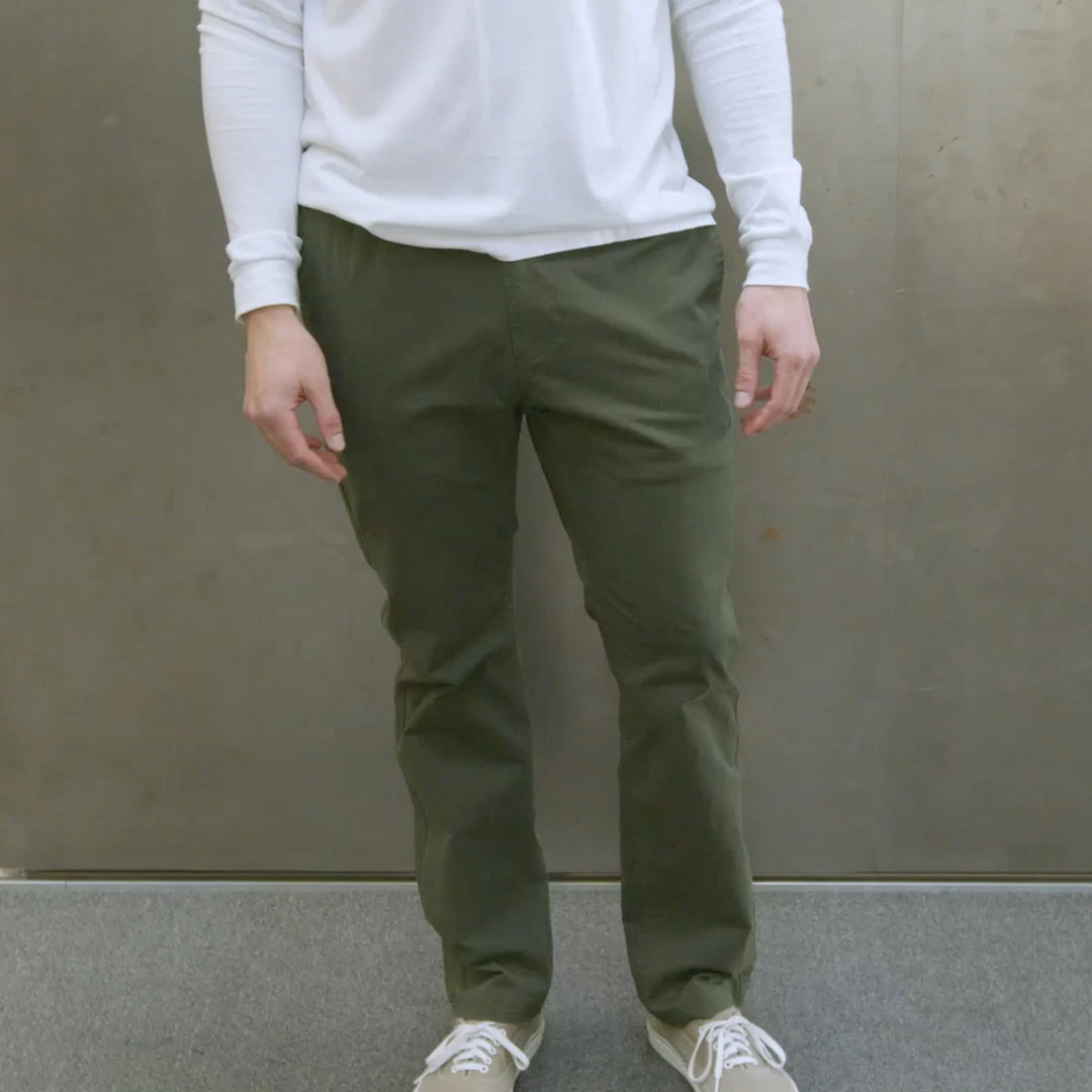 Regular fit, elastic waist pant with button and zip fly, build-in patterned nylon webbing belt and recycled clip lock buckle, front on seam pockets, back patch pocket and welt pocket with button closure, lower thigh welt pocket, self-fabric locker loop at center back beltloop, gusset, thick thread and double needle reinforced seams. Â