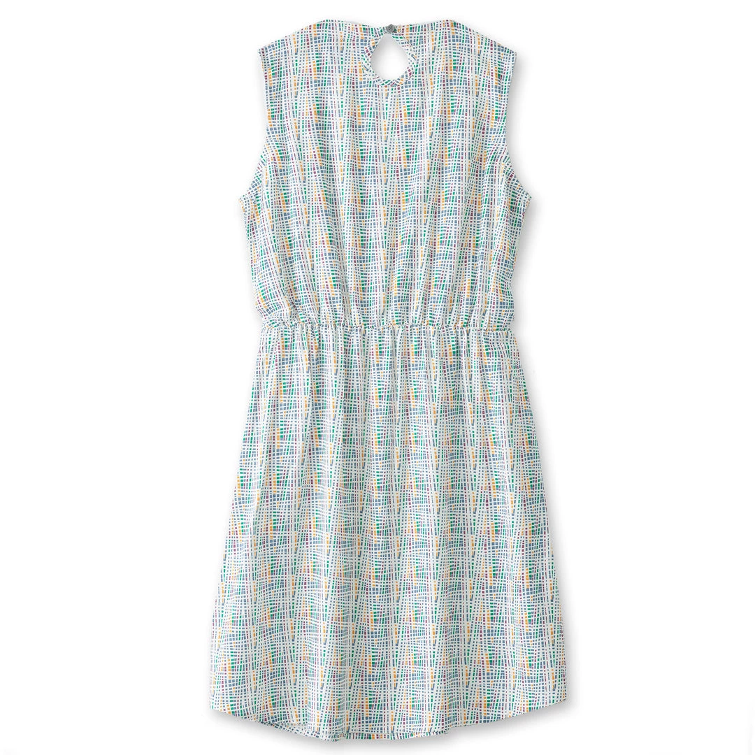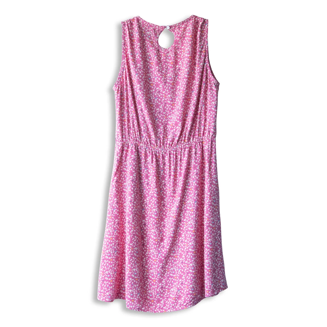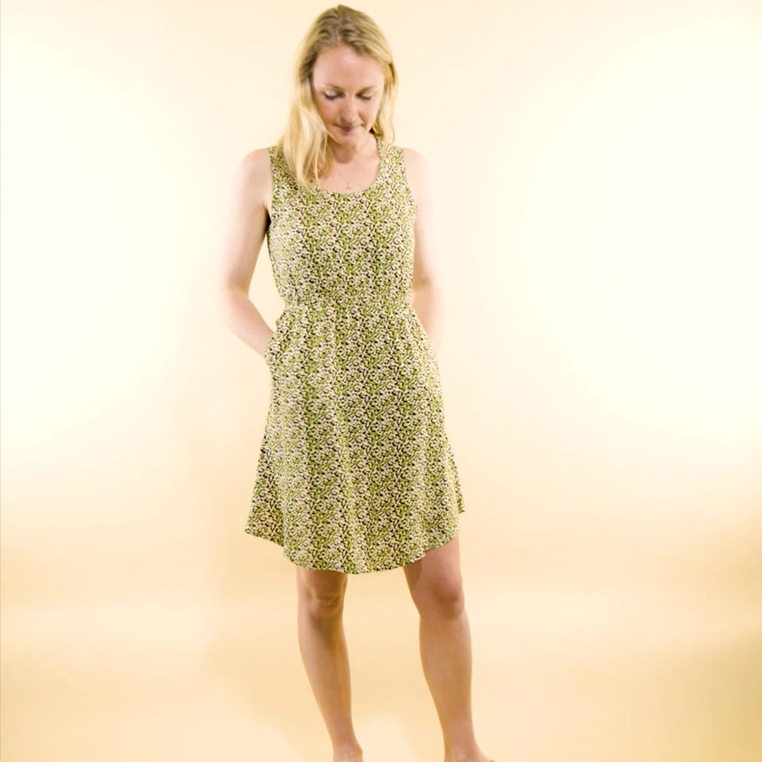 Semi-fitted sleeveless dress, elastic waist, scoop neck, front pockets, back keyhole styling, straight hem, length hits mid-thigh.