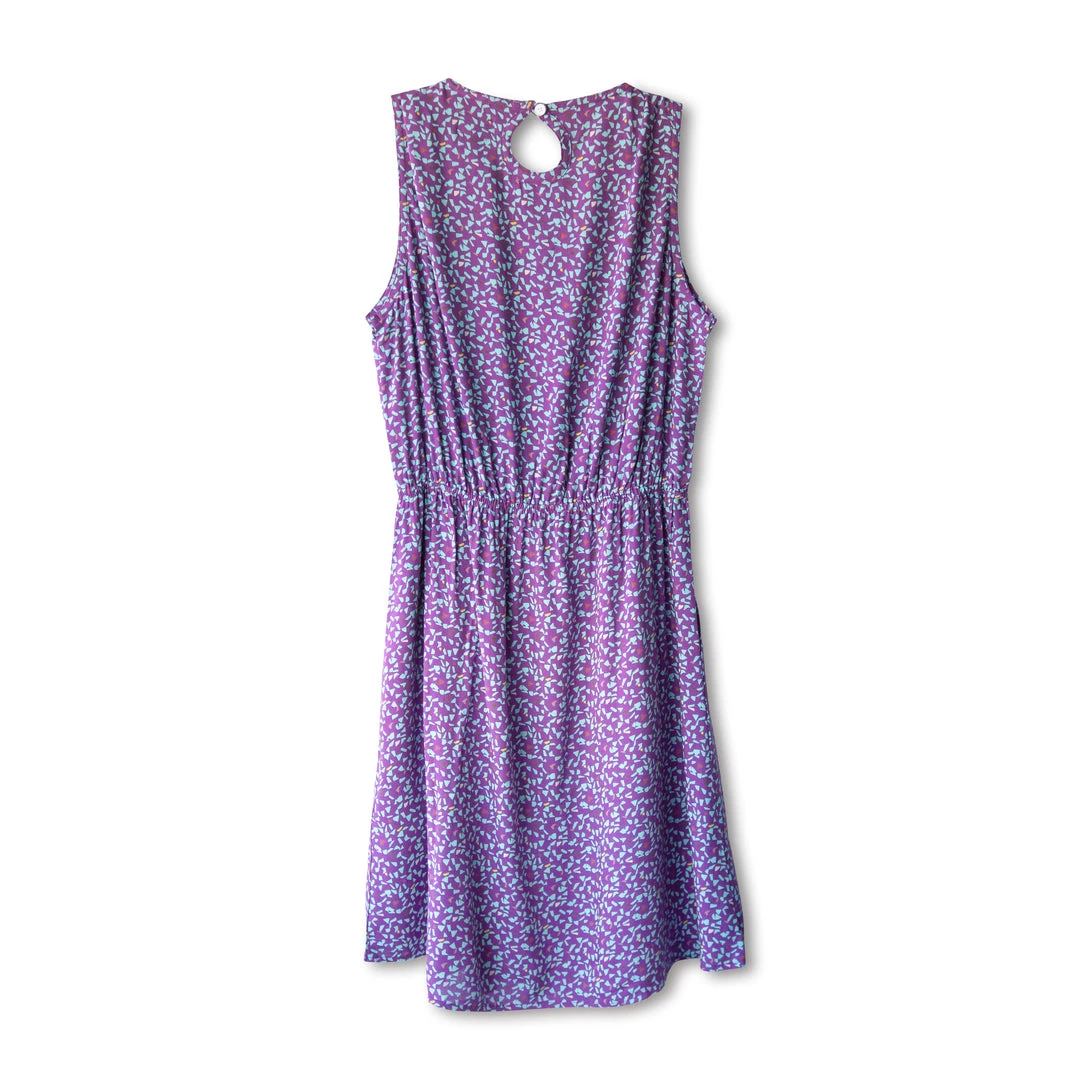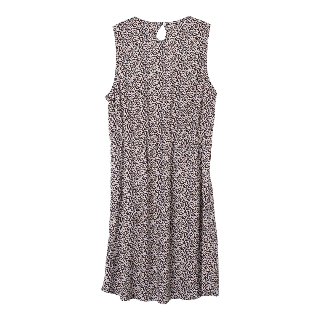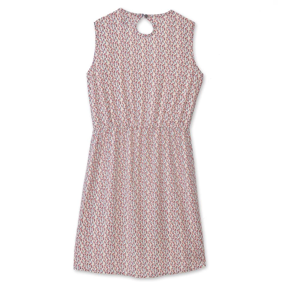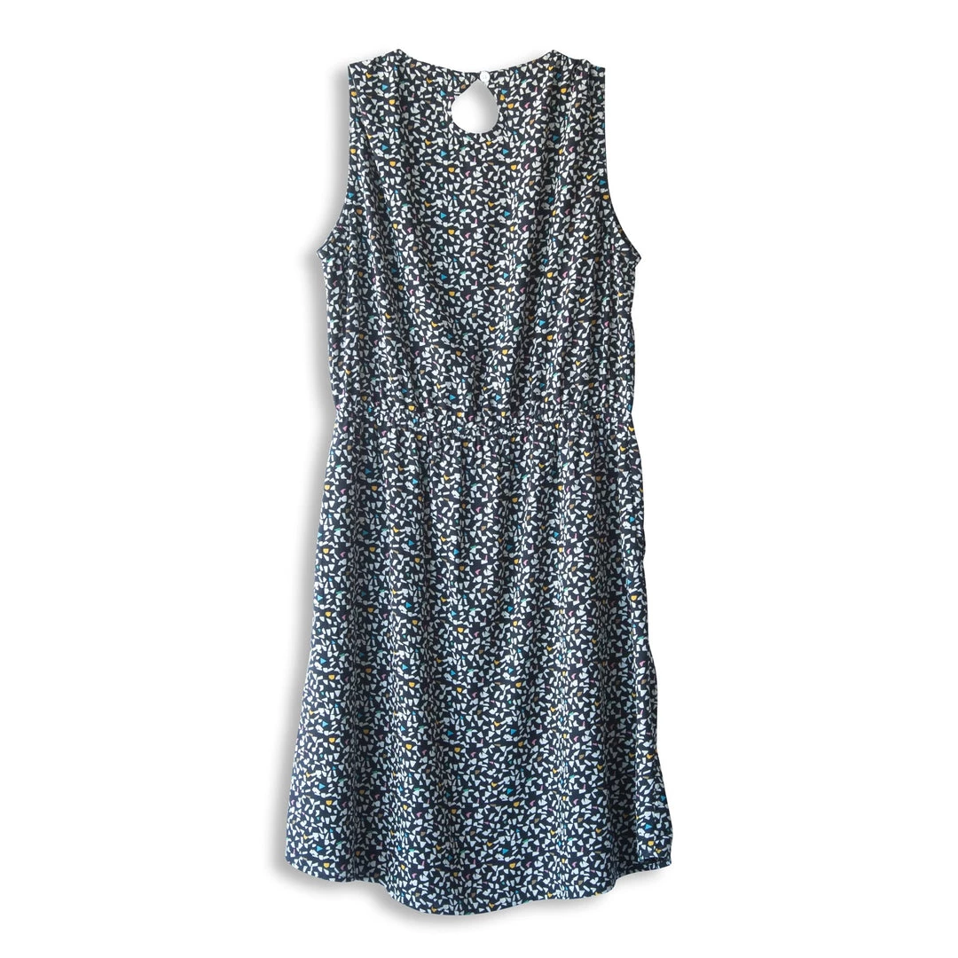 Semi-fitted sleeveless dress, elastic waist, scoop neck, front pockets, back keyhole styling, straight hem, length hits mid-thigh.