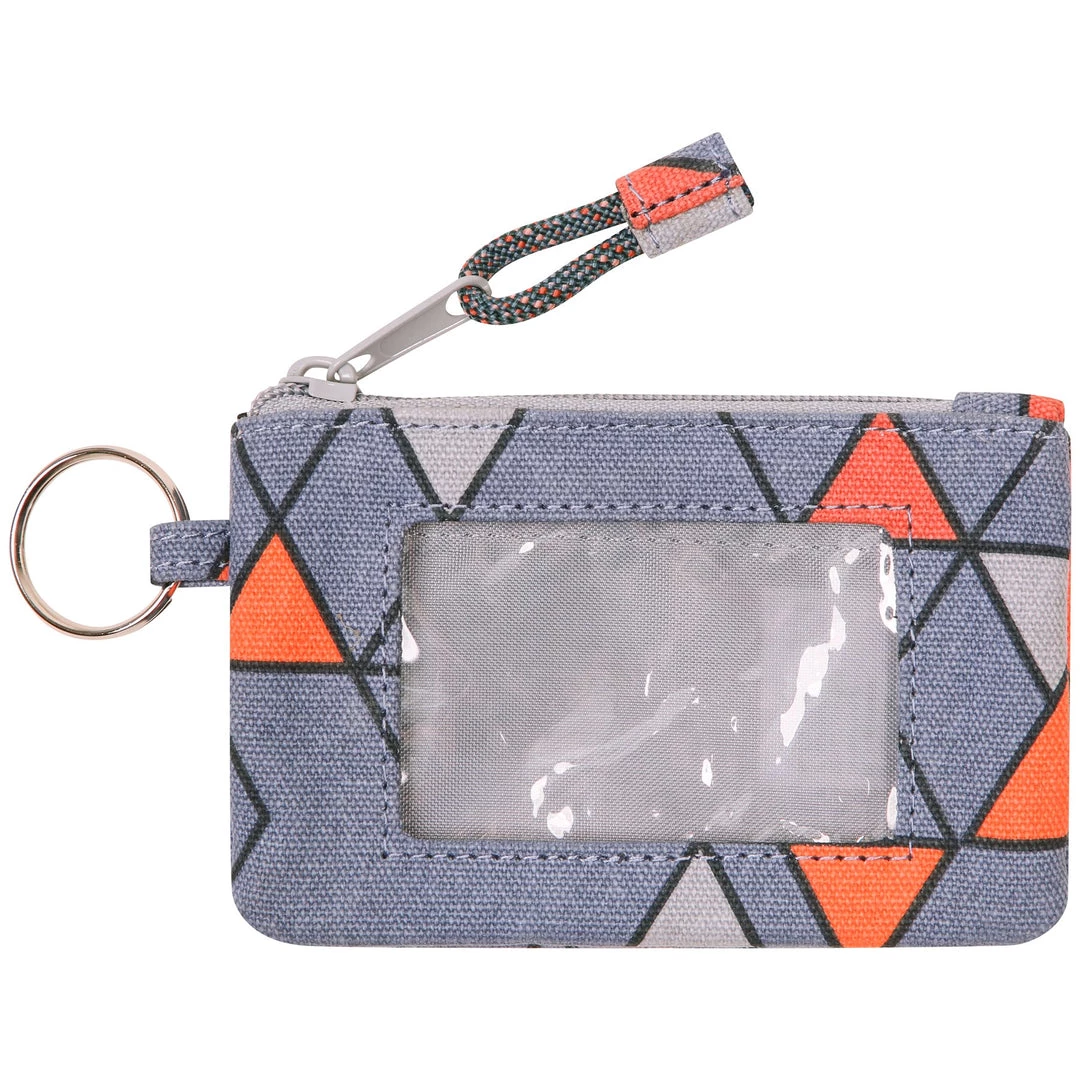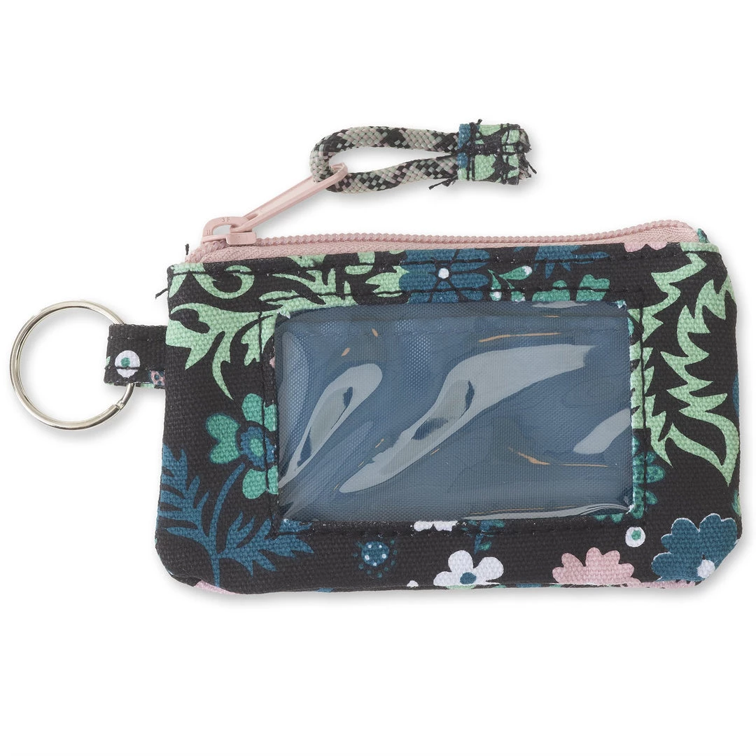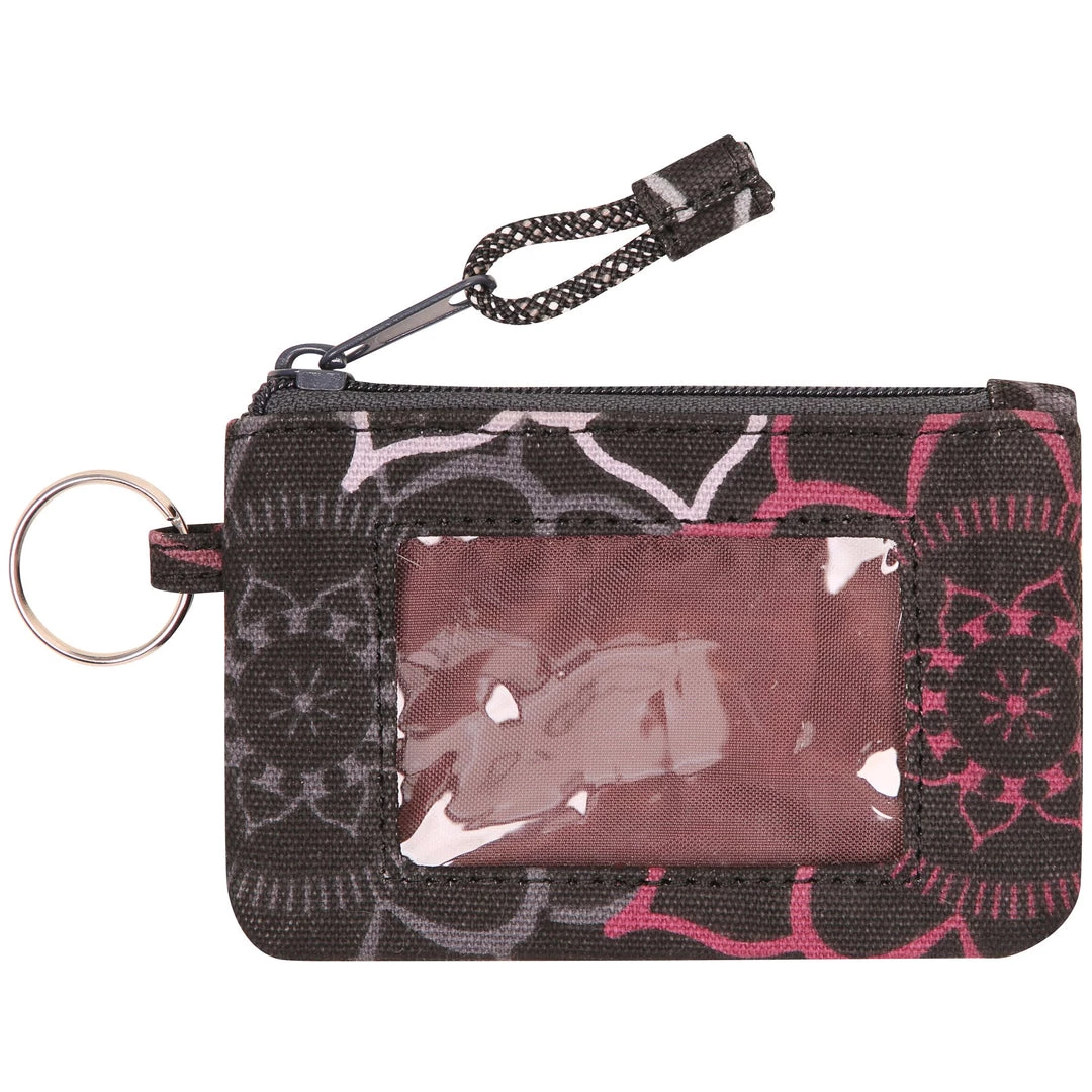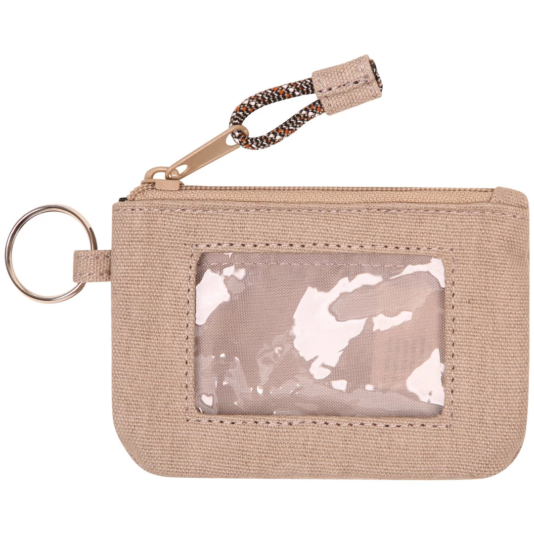 Double sided wallet with metal key ring, zip compartment with ID window and rope loop zip pull.