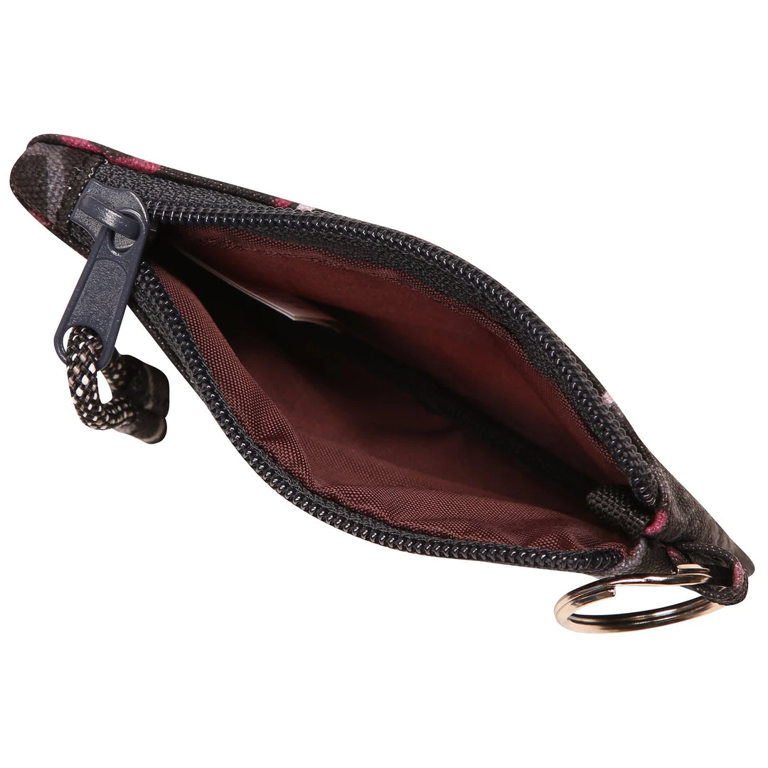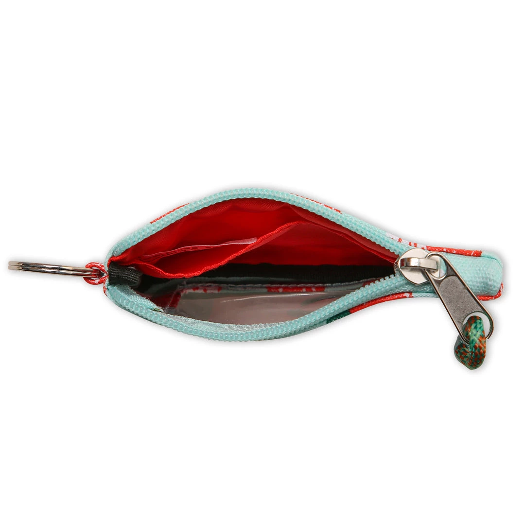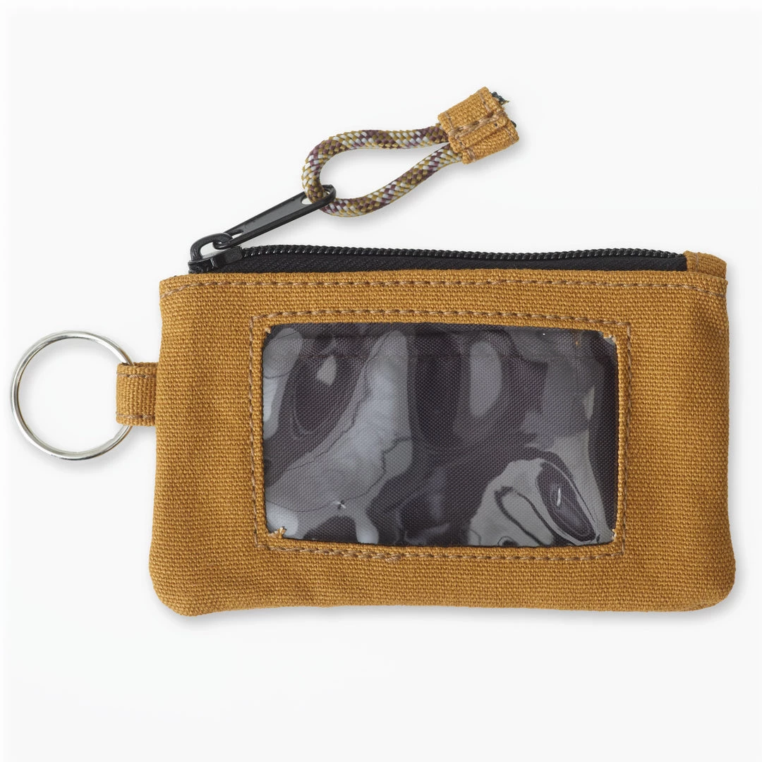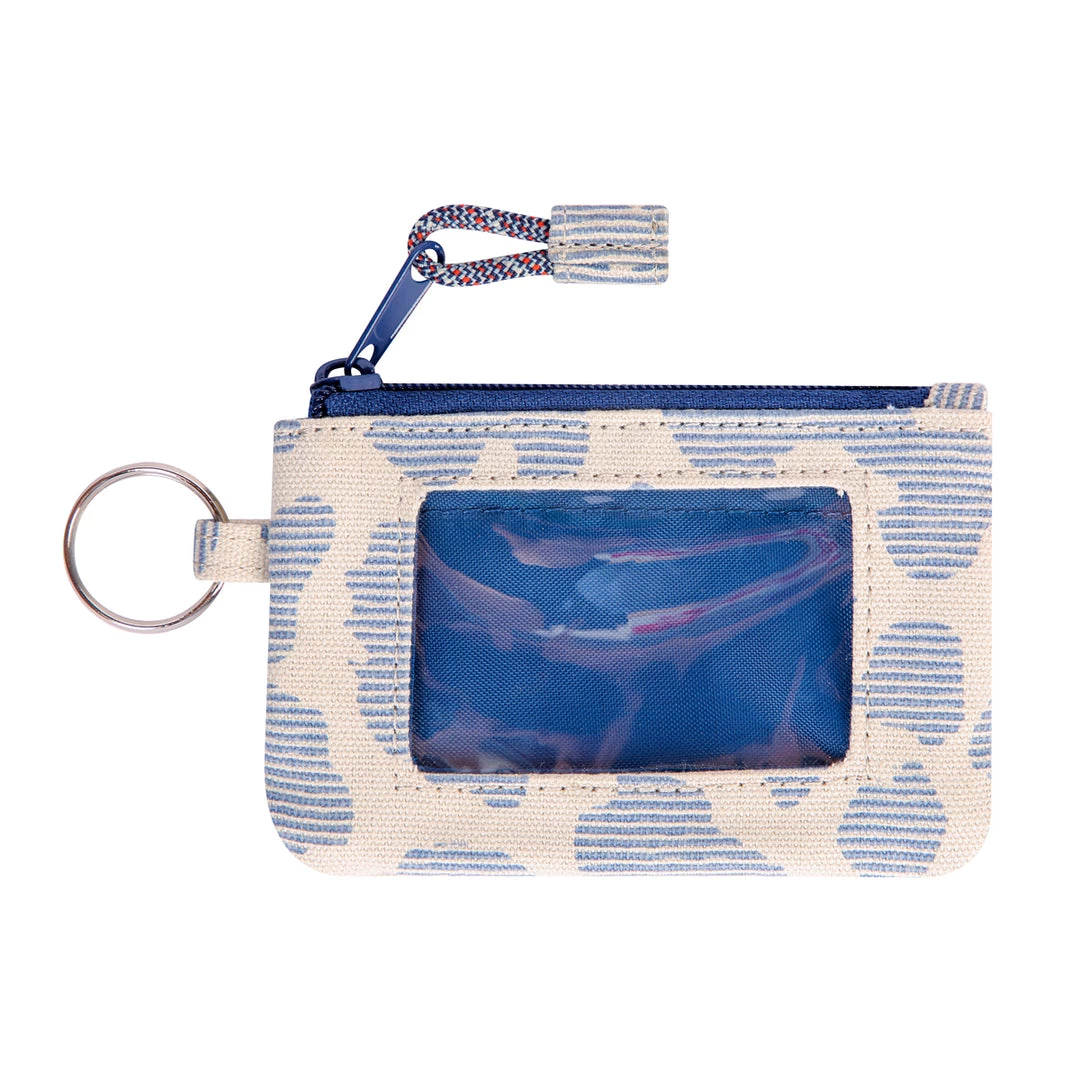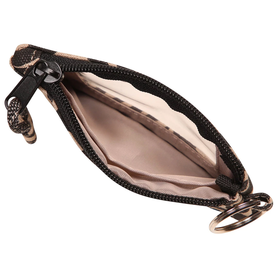 Double sided wallet with metal key ring, zip compartment with ID window and rope loop zip pull.