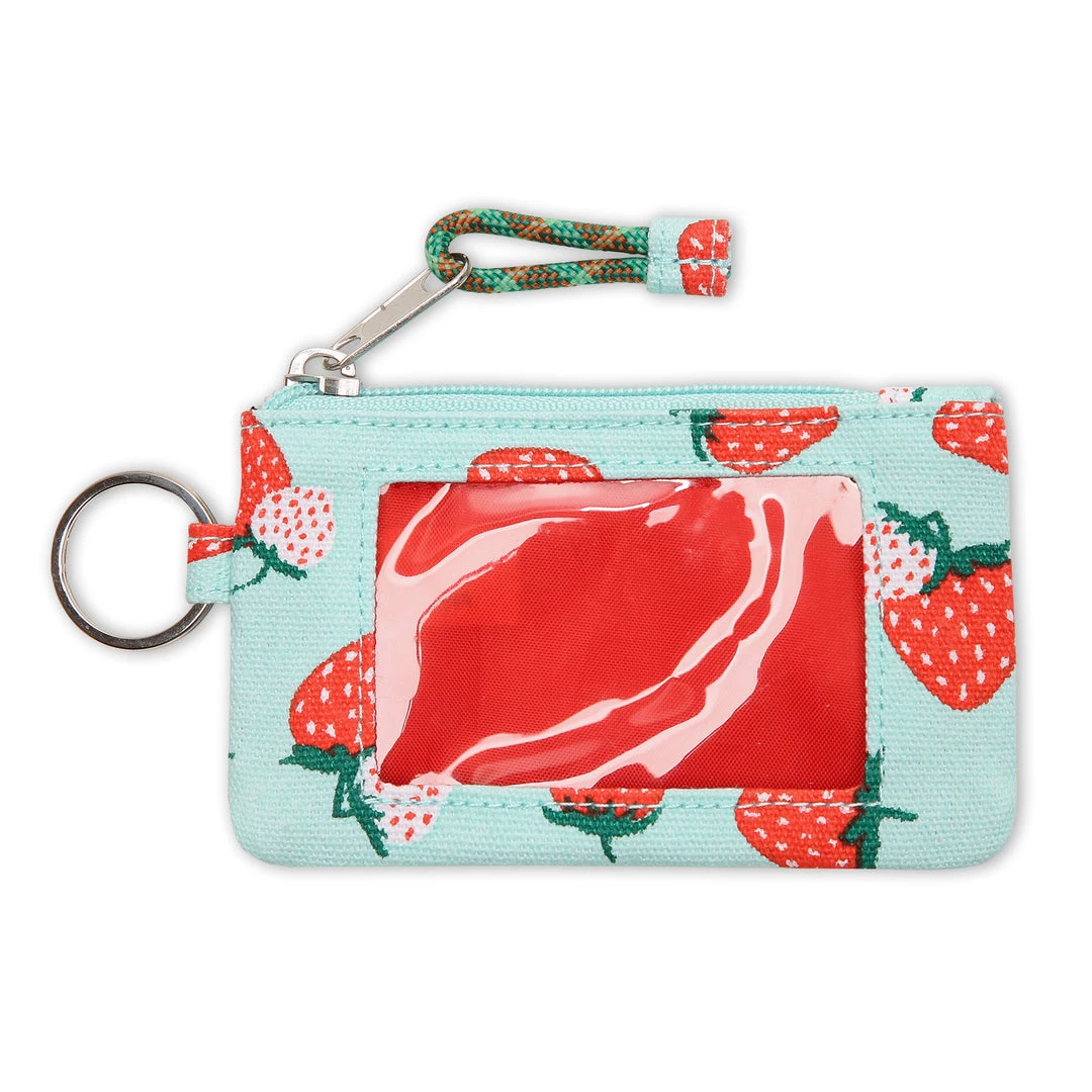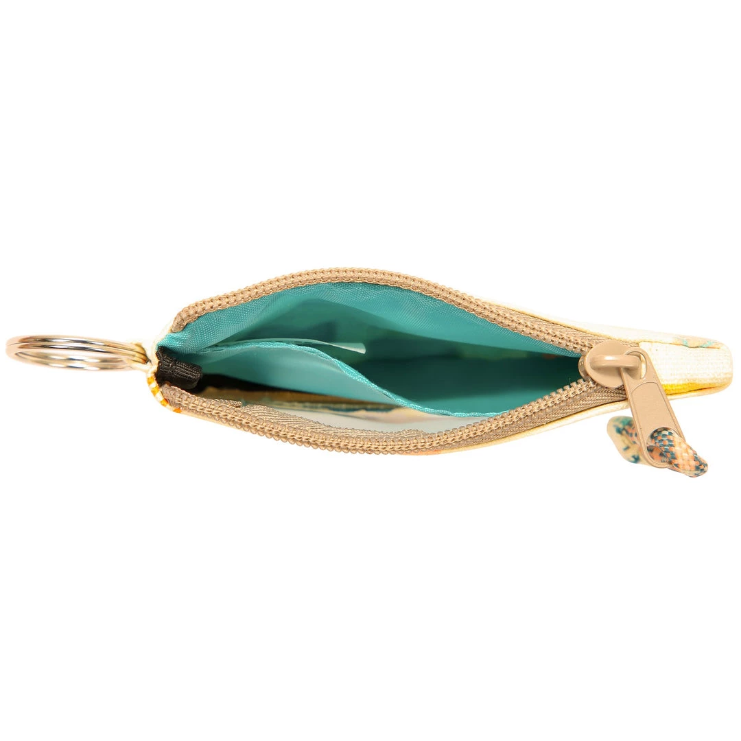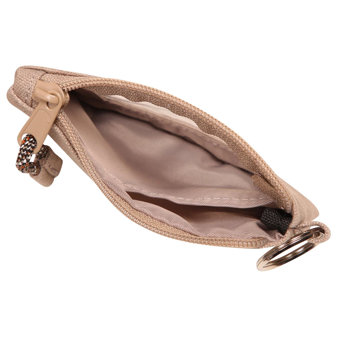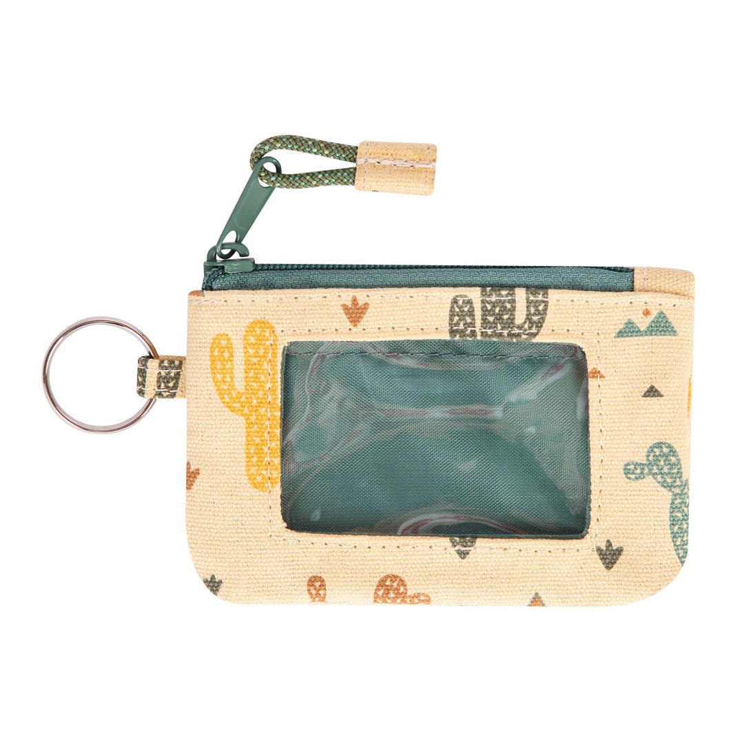 Double sided wallet with metal key ring, zip compartment with ID window and rope loop zip pull.