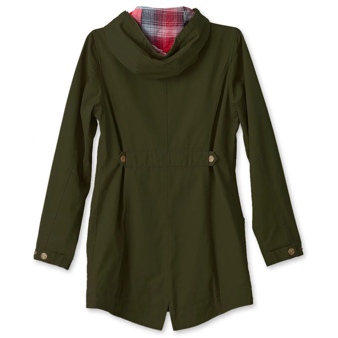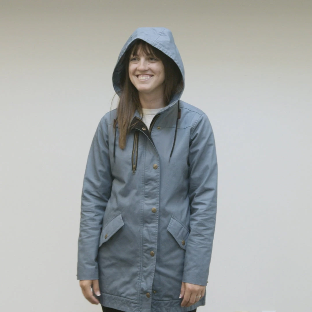 Semi-fitted, mid-thigh length, full zip jacket with hood and covered snap placket, nylon liner with corduroy accents, external zipper pocket, lower flap pockets, adjustable sleeve cuffs and back belt, back bottom slit, thick thread and large antique brass zippers and snaps.