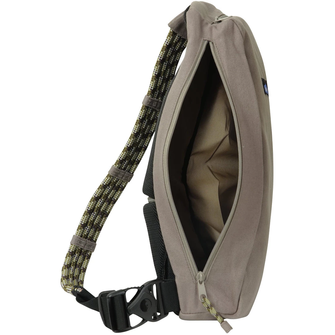 Sling pack rucksack with one adjustable rope shoulder strap with side release buckle that can switch to be worn on wearers right or left shoulder, elastic keeper on strap end, two vertical zip compartments with rope zip pulls, one small zip pocket at top, padded back mesh panel with hidden zip pocket.