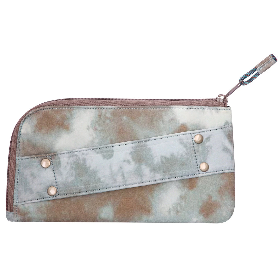 Semi padded clutch wallet with zip closure and rope loop zip pull, back padded hand strap with antique nickel rivets, internal zip pocket and multiple internal cash, card, ID slots