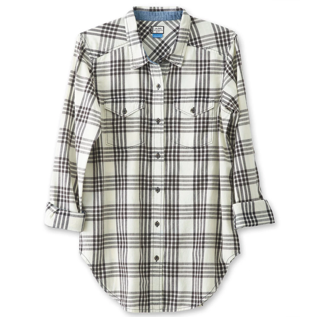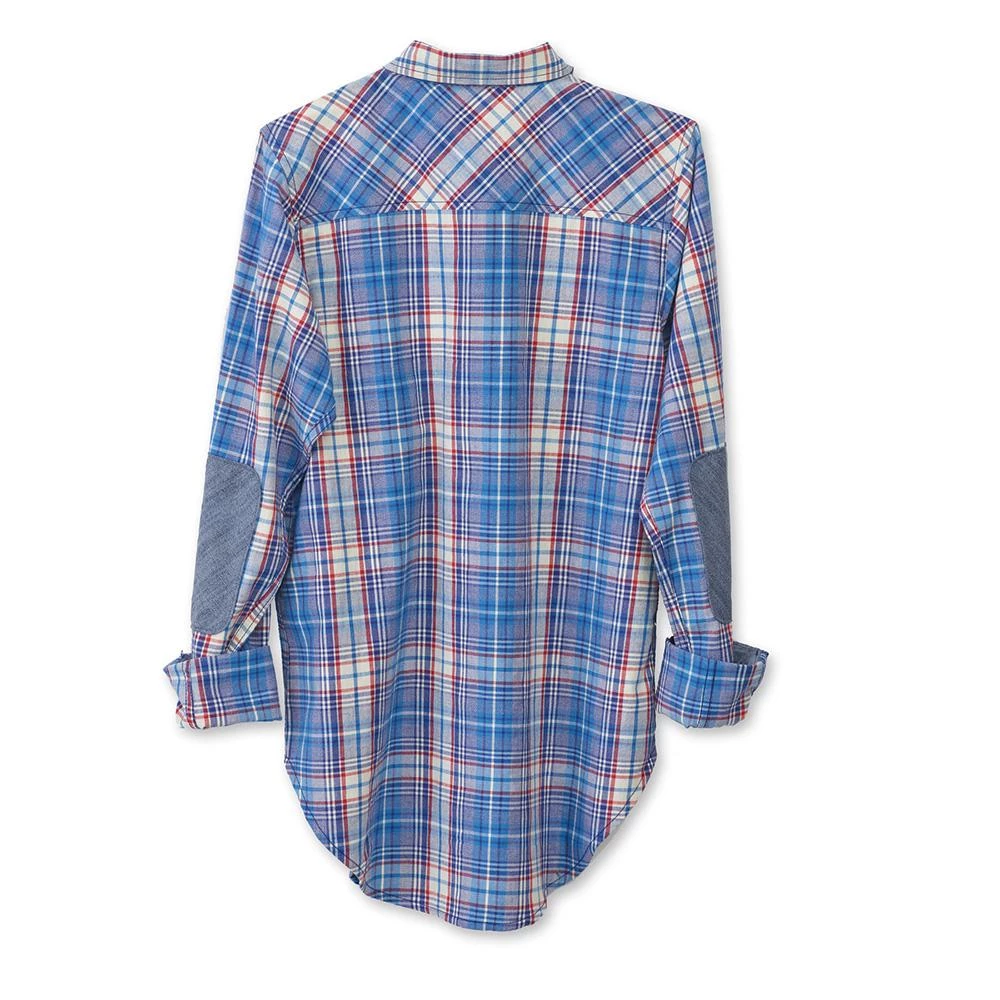 Boyfriend fit, long sleeve button up shirt, stand collar, two chest flap pockets, elbow patches, deep curved hem.