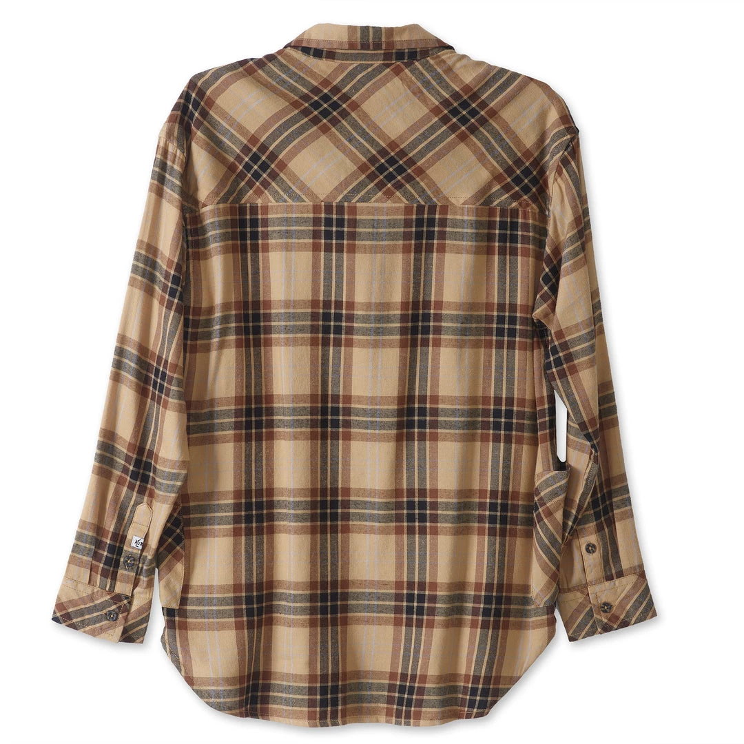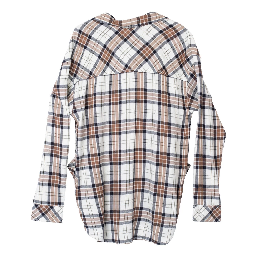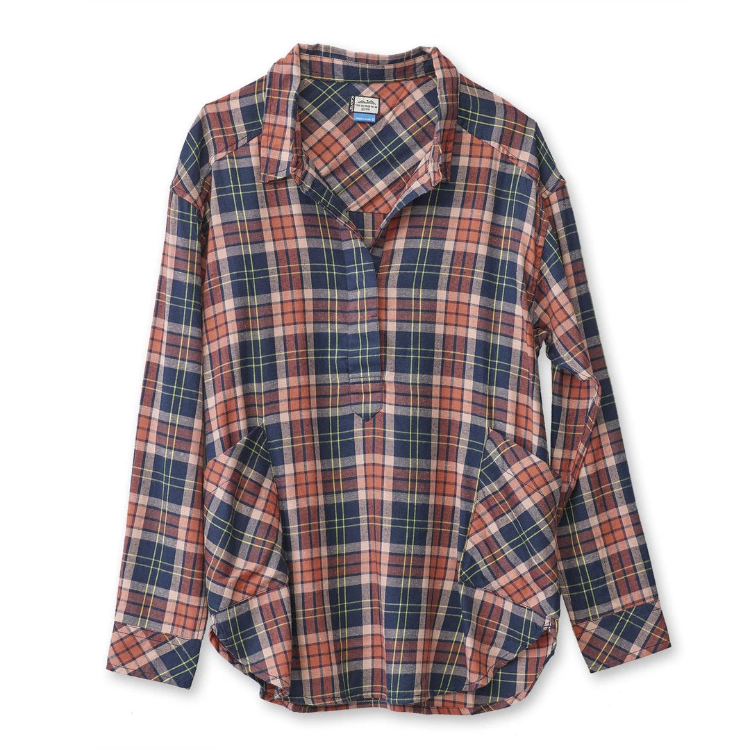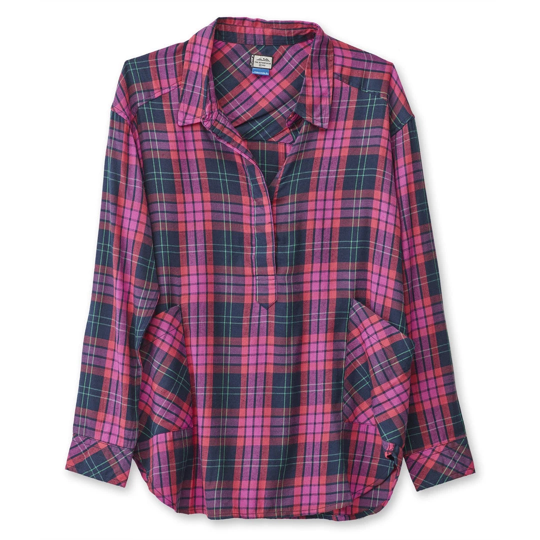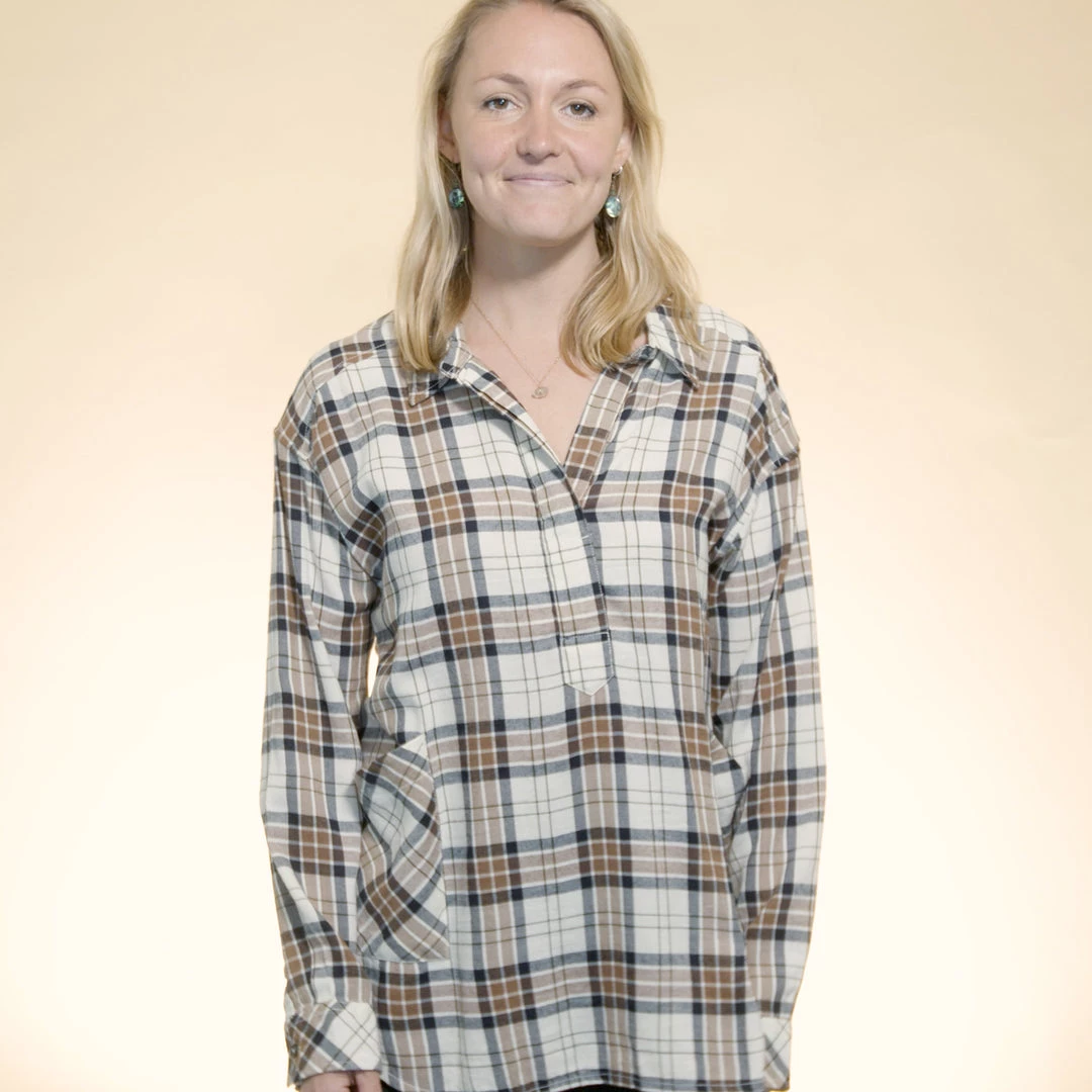 Relaxed fit, long sleeve half placket shirt with hidden 25% certified recycled polyester matte buttons, stand collar, lower patch pockets, deep curved hem.