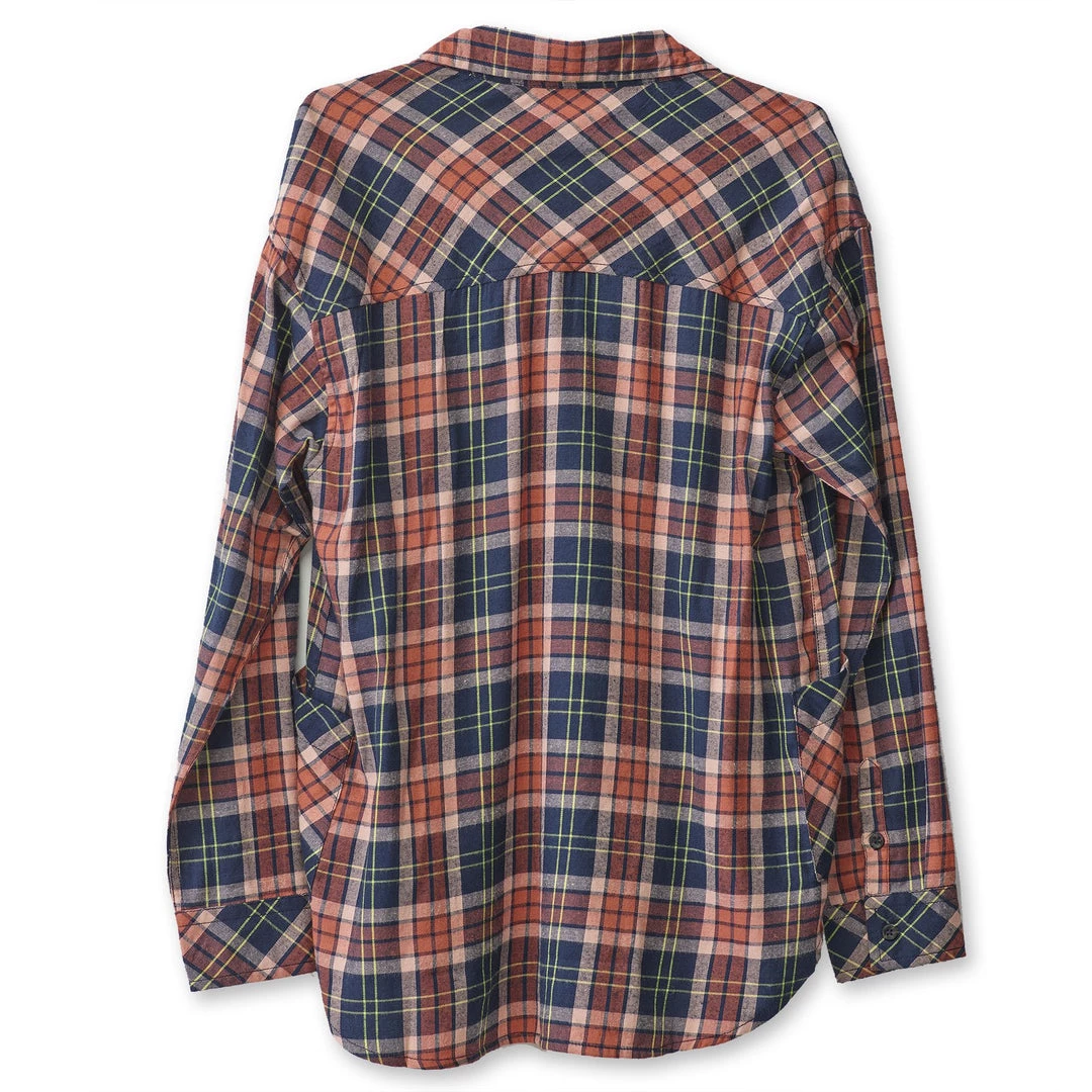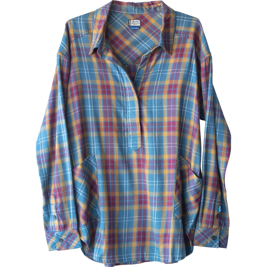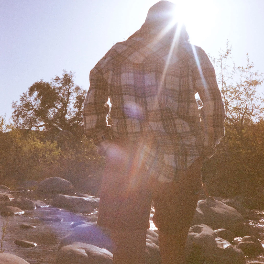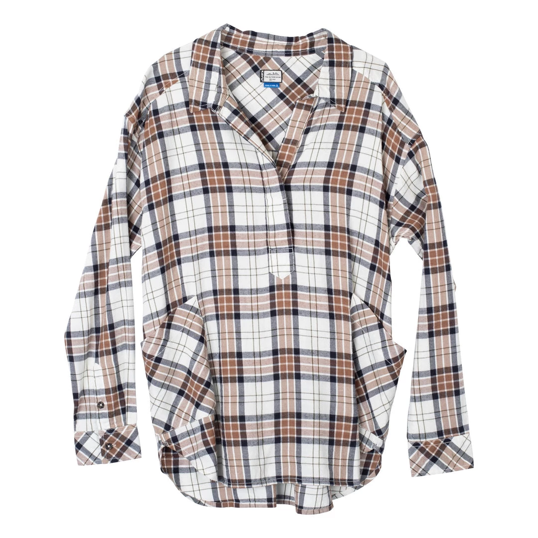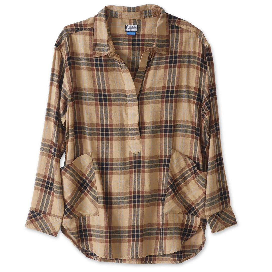 Relaxed fit, long sleeve half placket shirt with hidden 25% certified recycled polyester matte buttons, stand collar, lower patch pockets, deep curved hem.