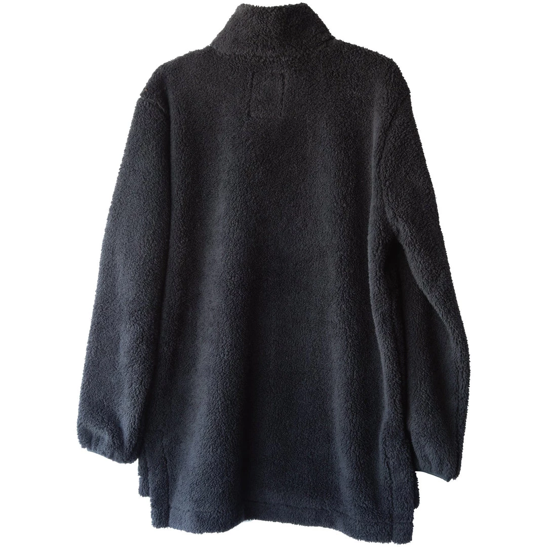 Relaxed fit, half zip mock neck pullover, elastic binding on sleeve cuffs and zipper, hand pockets, high low hem with side vents.