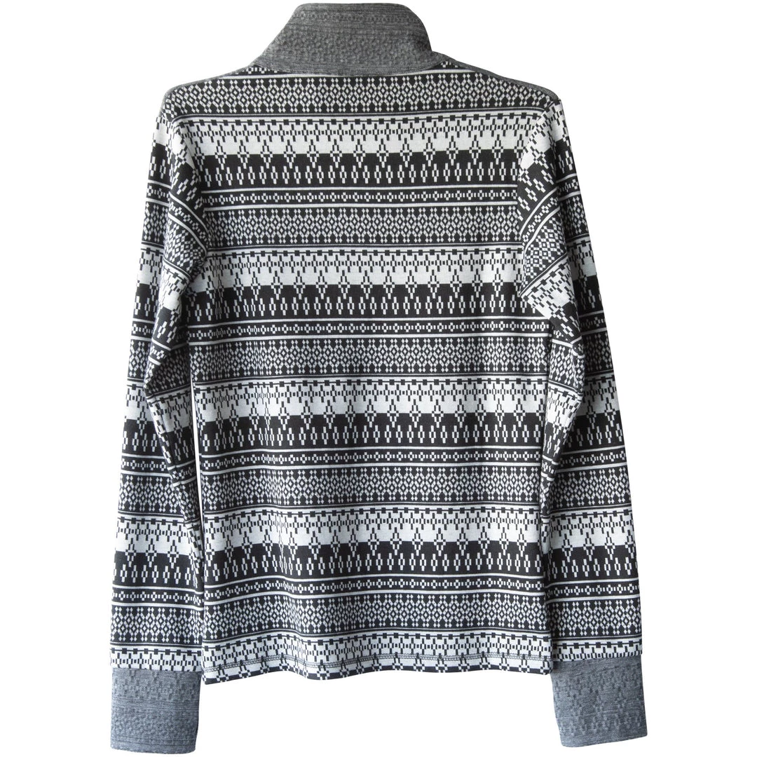 Semi-fitted, long sleeve half zip jacquard knit shirt, fabric reversed on zipper cover, shoulder yokes and sleeve cuffs, thumb loops, cover stitch detail, straight hem.